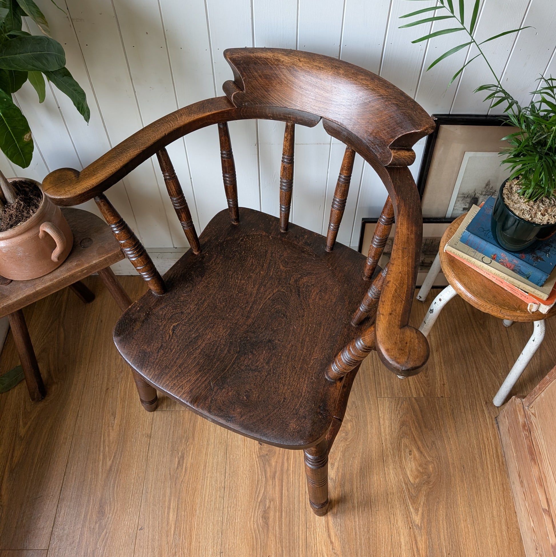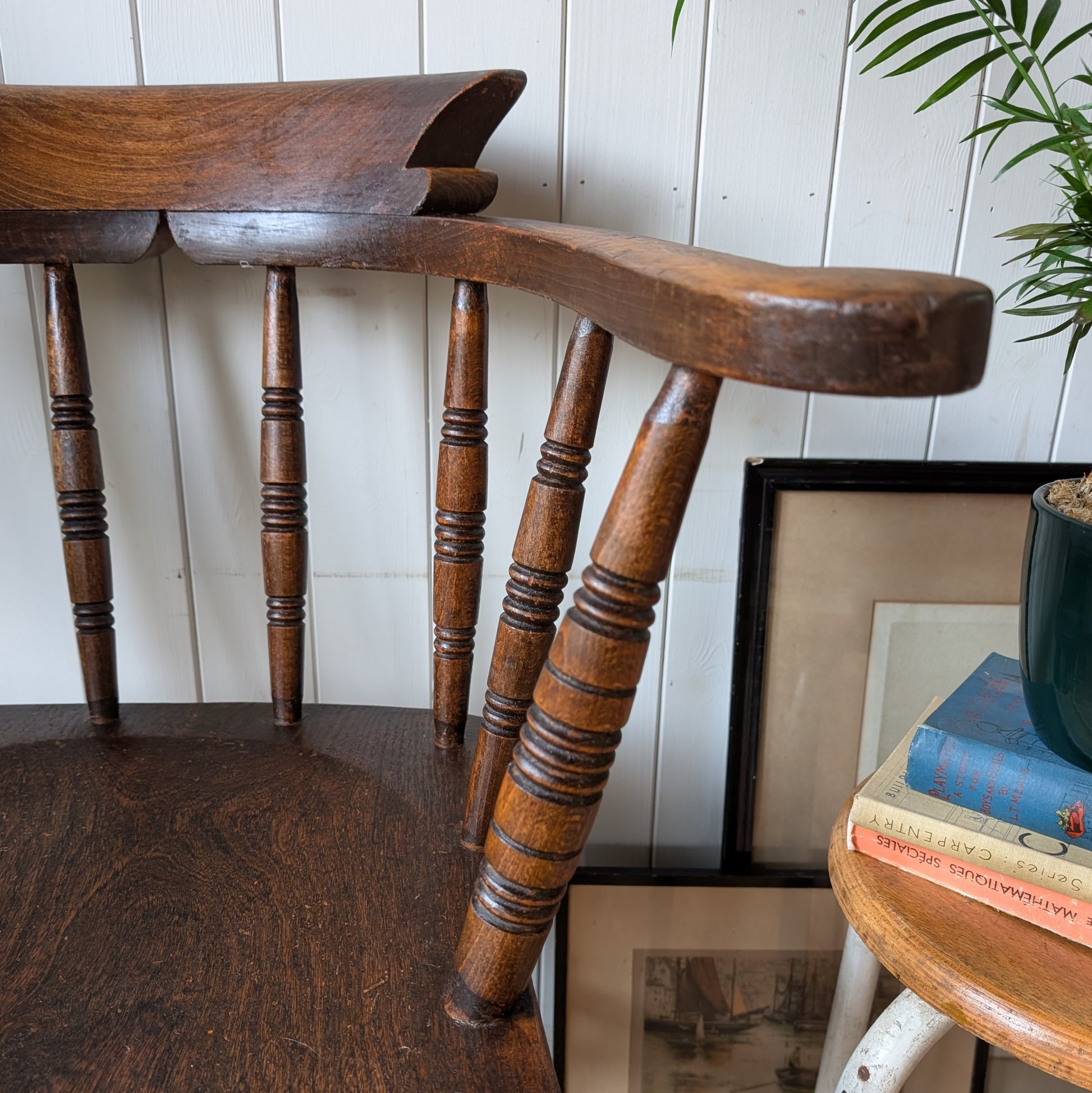 For sale is this very handsome Antique captains chair. It has an beautiful genuine patina with tons of bangs, bumps and scratches and particularly nice wear to the original finish. It's had a clean and wax keeping its character but making it nice and clean. It has a very comfortable saddle seat, turned spindles legs and stretchers and is particularly well made. It's constructed from solid beech with an elm seat pad.