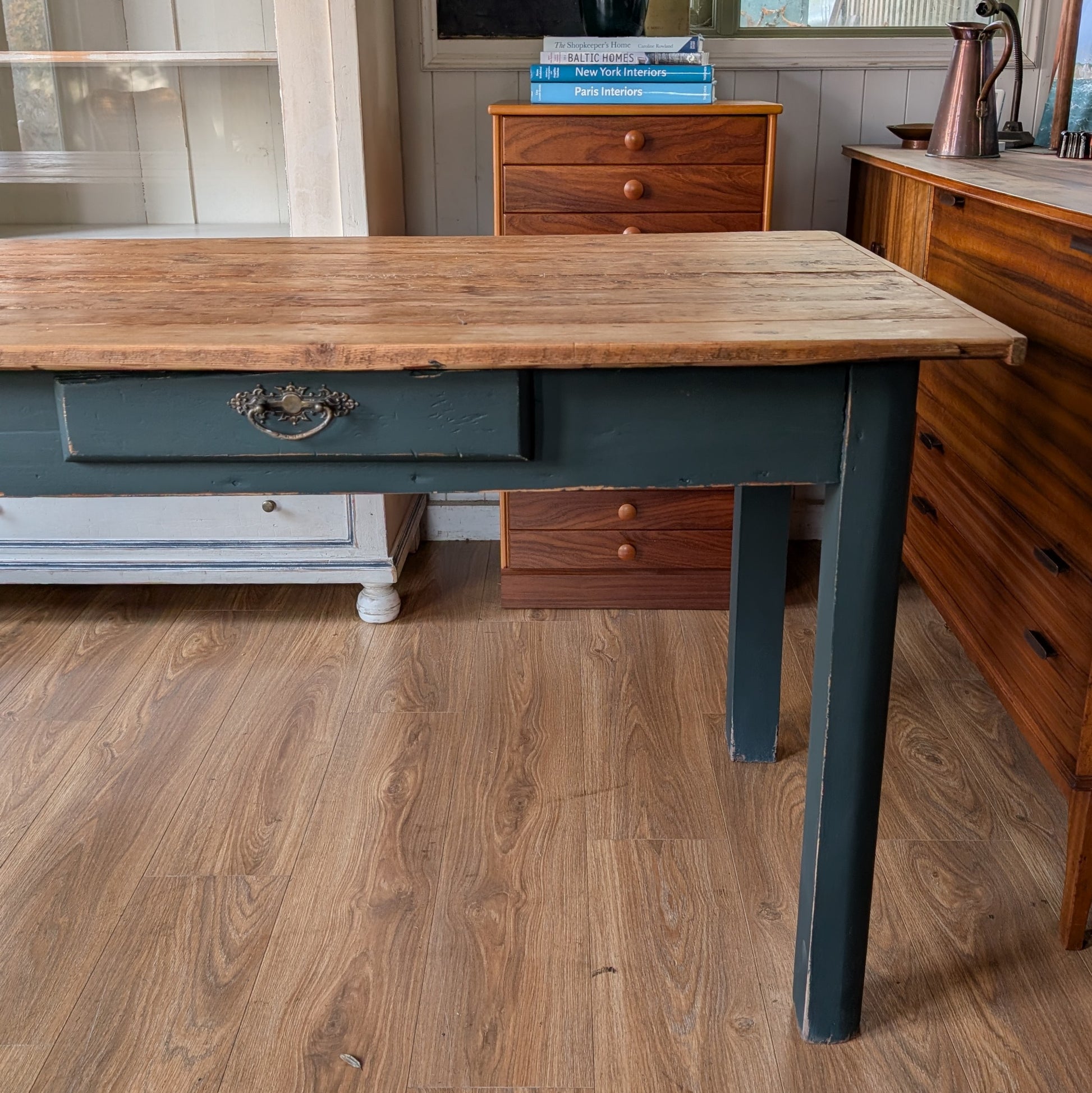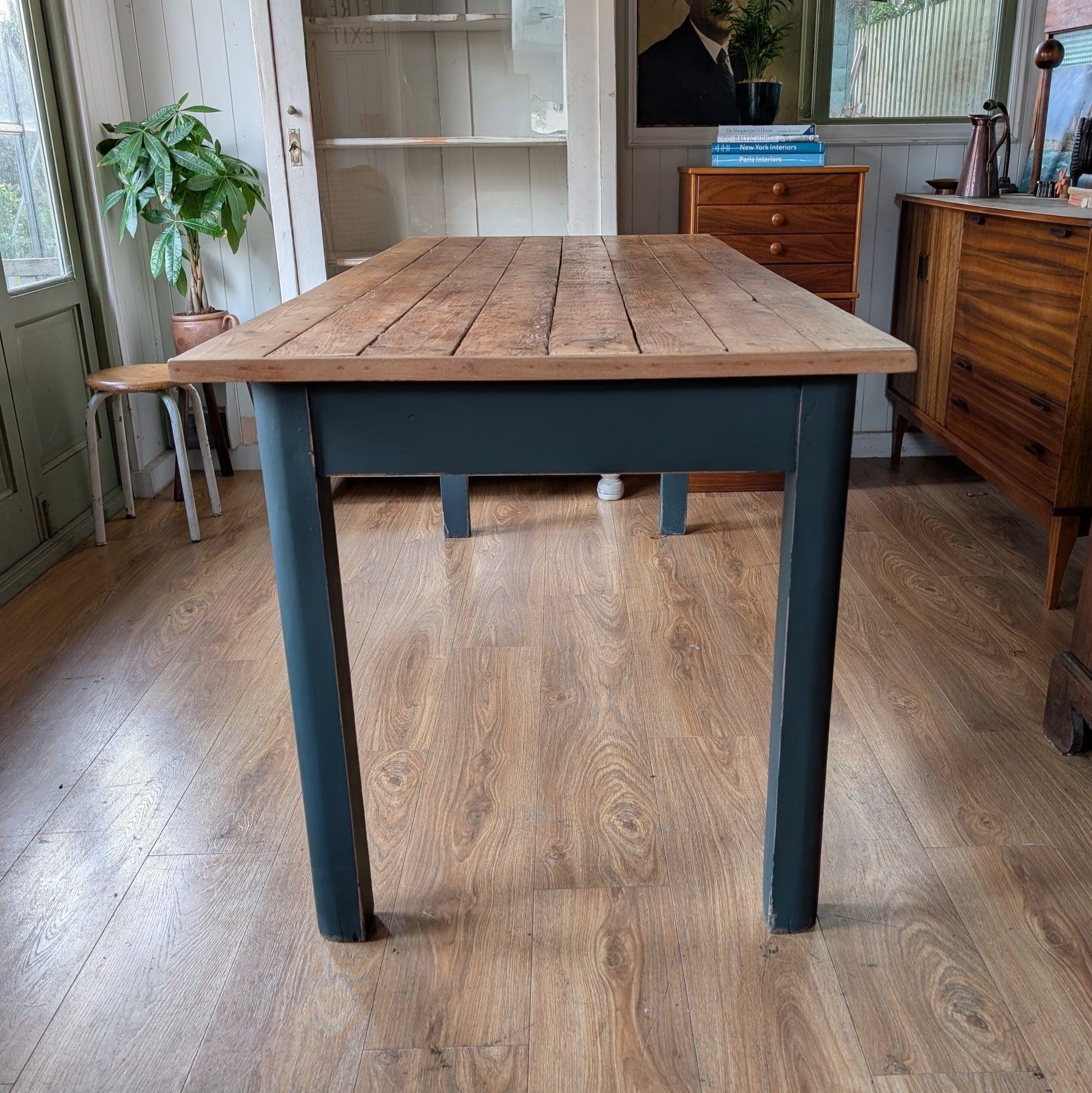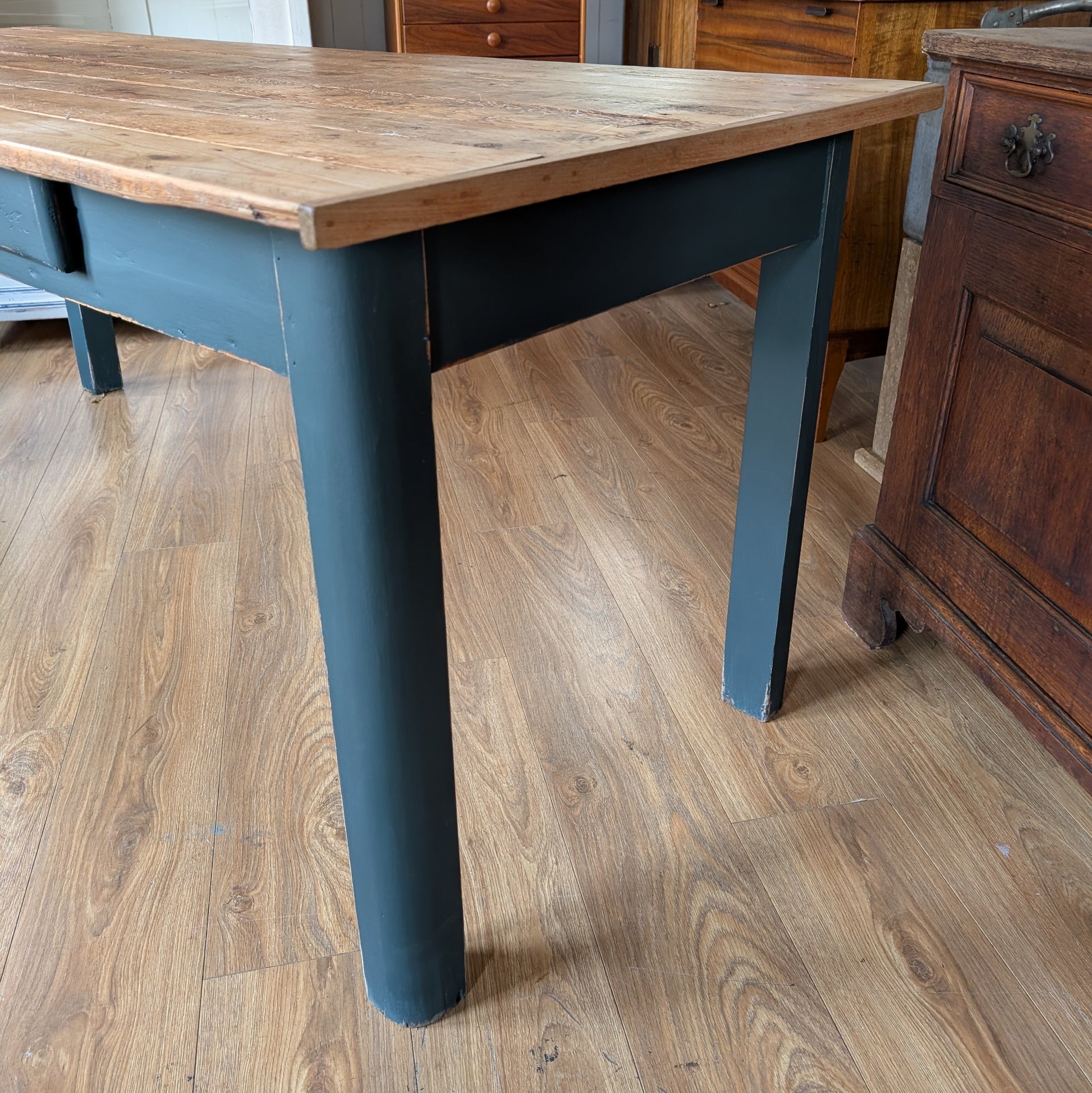 For sale is this very beautiful, rustic, Antique Pine Dining Table. The top is particularly nice with fantastic genuine patina which really oozes rustic French charm. The base has been painted in Little Greene‘s Obsidian Green (a moody green/black) with light distress. This one is particularly practical with two drawers great for placemats, wipes or even cutlery. The top has had a clean and wax, keeping its patina but making it nice and clean. It's a comfortable 8 seater and has classic refectory proportions being long yet not too wide. All in all a fantastic dining table that would add instant character to any home.