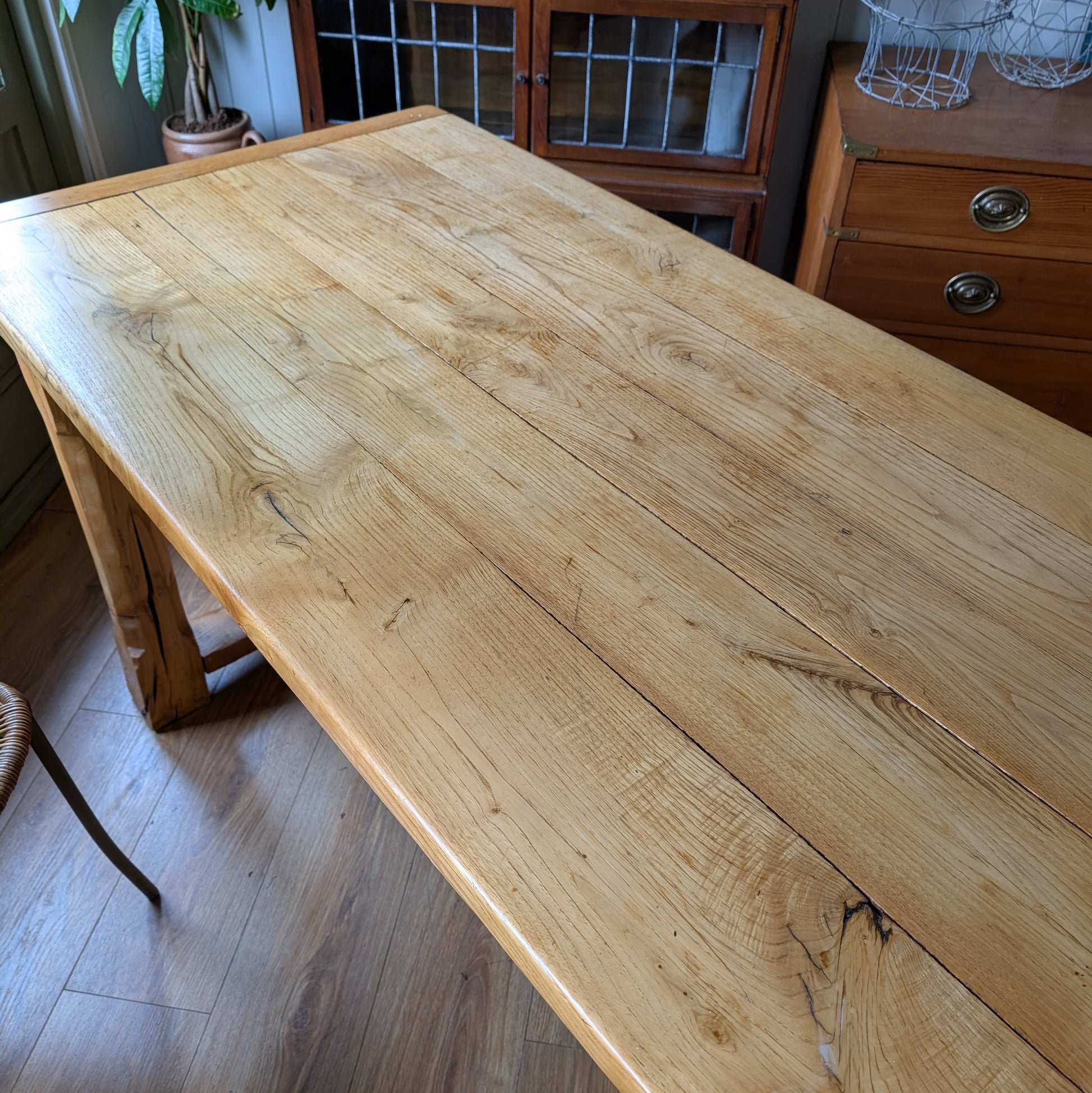 For sale is this absolutely stunning Antique Dining Table. It comes in fantastic aged condition with genuine patina, character and charm. This was professionally restored a few years ago (not by myself) including tightening the gaps and refinishing the top, apparently in some sort of a boat varnish which now makes the surface incredibly hard wearing. It has a really lovely colour and tone and is narrow yet long perfect for a lounge kitchen diner or knocked through kitchen diner. I'd say it's a genourous 6 seater but you could seat 8 on occasion.