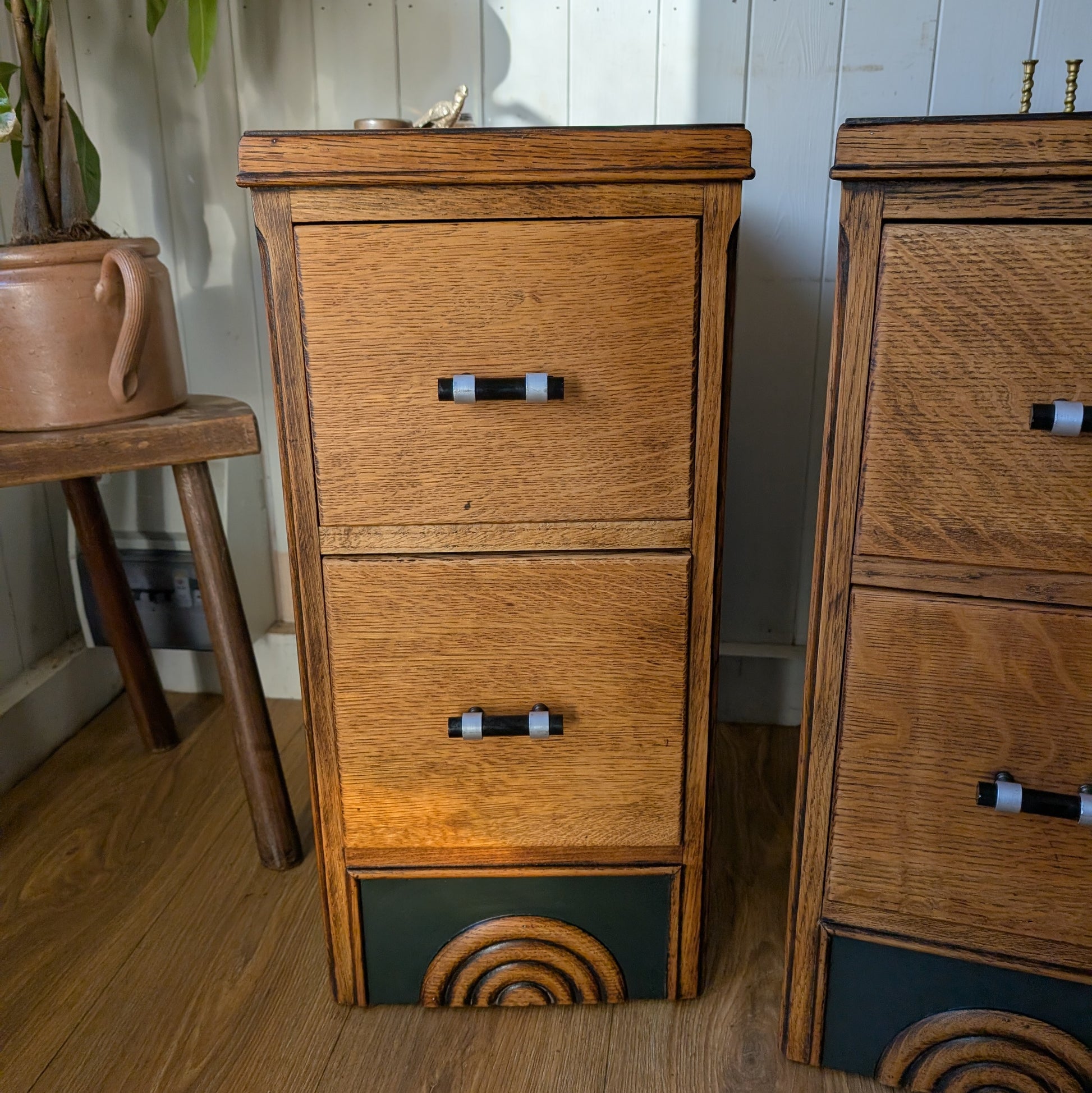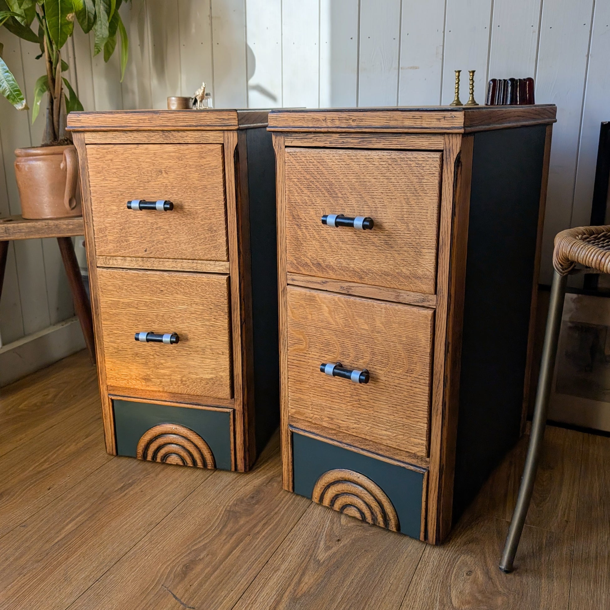 For sale is this very beautiful pair of upcycled Art Deco Bedside Tables. They're really stylish and have a particularly nice shape and style with subtle details of quality. I'm pretty sure these have been upcycled from a dressing table but they've been nicely done and still reitain their original handles. The sides have been painted in Little Greene‘s Obsidian Green which compliment the shape and style perfectly. The oak has been sensitively refinished keeping its patina but giving it a subtle update. All in all a beautiful and practical pair of drawers which would add character to any bedroom.
