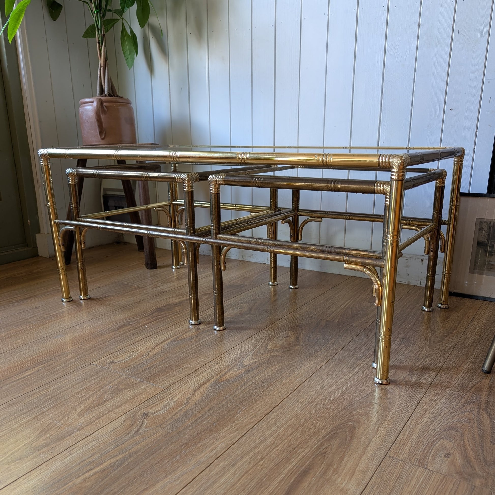 For sale is this very cool set of Modernist 1970`s tables. They have an unique & attractive design comprising of a main rectangular coffee table and the two square side tables which work together as a nest of tables. They can be used together as a central/nesting coffee table, or the two square tables separate as side tables. This faux bamboo guilt furniture is particularly saught after and this is a really nice set in great condition. The glass has minimal scratches and the brass has tarnished perfectly over time giving them a lovely faded grandeur feel.