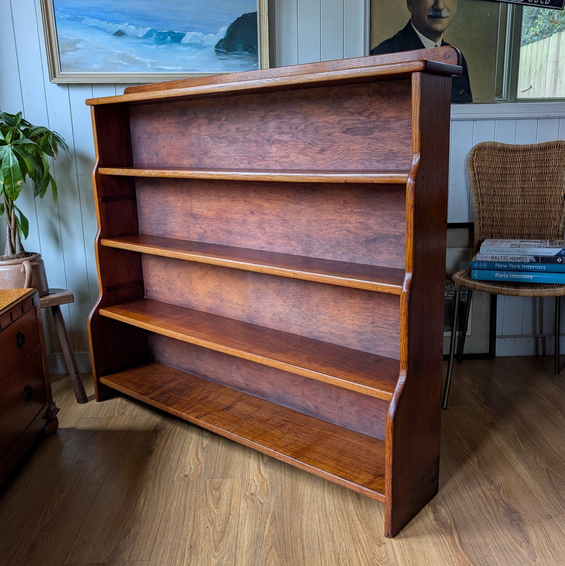For sale is this absolutely gorgeous Antique Waterfall Bookcase. It's made from solid oak which has the most beautiful genuine patina. It comes in totally original condition I've just given it a clean and fresh coat of wax. The waterfall sides graduate from top to bottom getting marginally deeper. The shelves range from 15cm - 23cm deep and the top depth is 16 centimeters. All in all a beautiful and practical piece which would add instant character to any home. Obviously great for books but would also be great in a kitchen or pantry for herbs, spices and jars of grains etc.