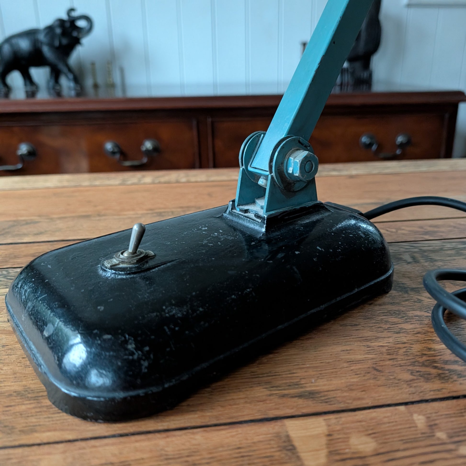 For sale is this very cool vintage machinist lamp manufacturered by Memlite. It's mainly green enamel mounted on a black base with toggle switch (all original). It's had a light clean and has been rewired and pat tested by a professional electrician. It comes in nice aged condition with subtle patina after decades of industrial use. Approximate height 70cm fully extended but it is obviously adjustable. A great looking vintage lamp perfect for a desk, studio, workspace or eclectic home.