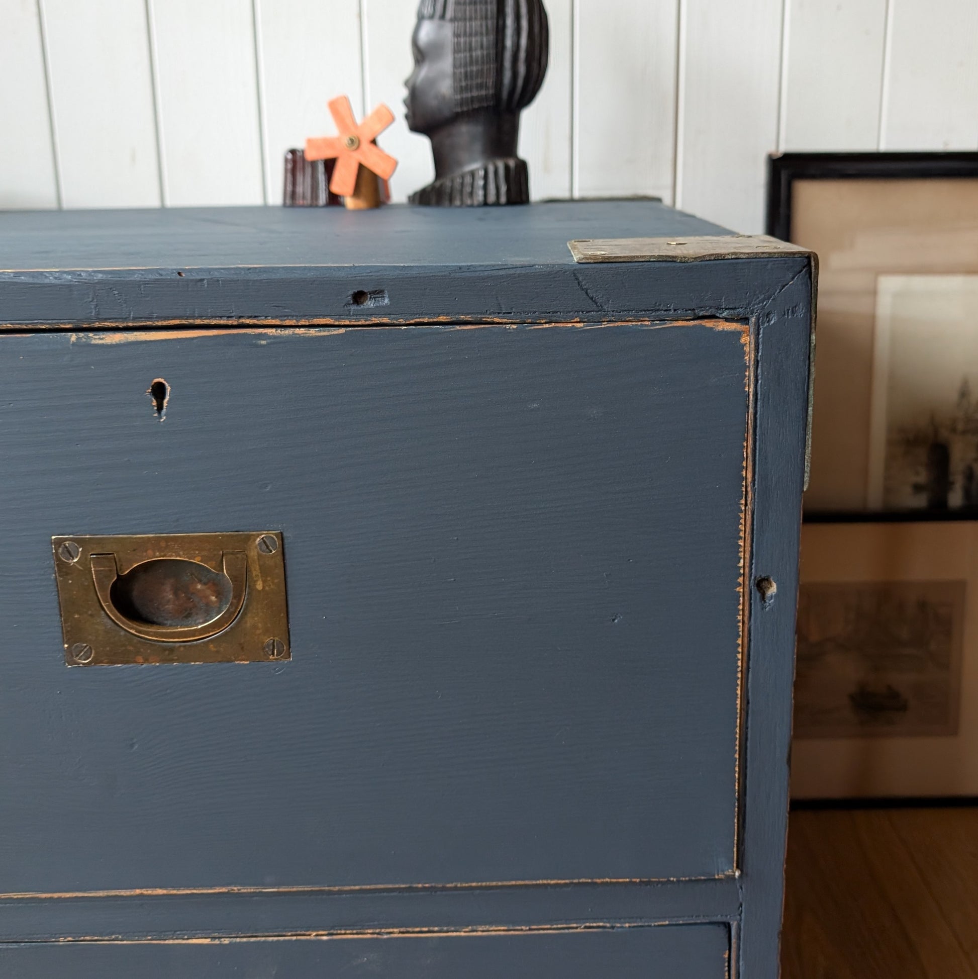 For sale is this very cool rustic antique military campaign chest. It's a lovely piece with bags of character and charm. It's been hand painted in Little Greene‘s Basalt (a mood navy blue with black undertones) with scruffy distress. It retains its beautiful original brass handles which look fantastic against the painted finish. The drawers run smoothly and are nice and deep. It's a great height to be used as an alternative to a TV unit or perhaps in a hallway or beetroot as a storage bench. Just to note one of the brass corner straps is missing from the bottom left corner.