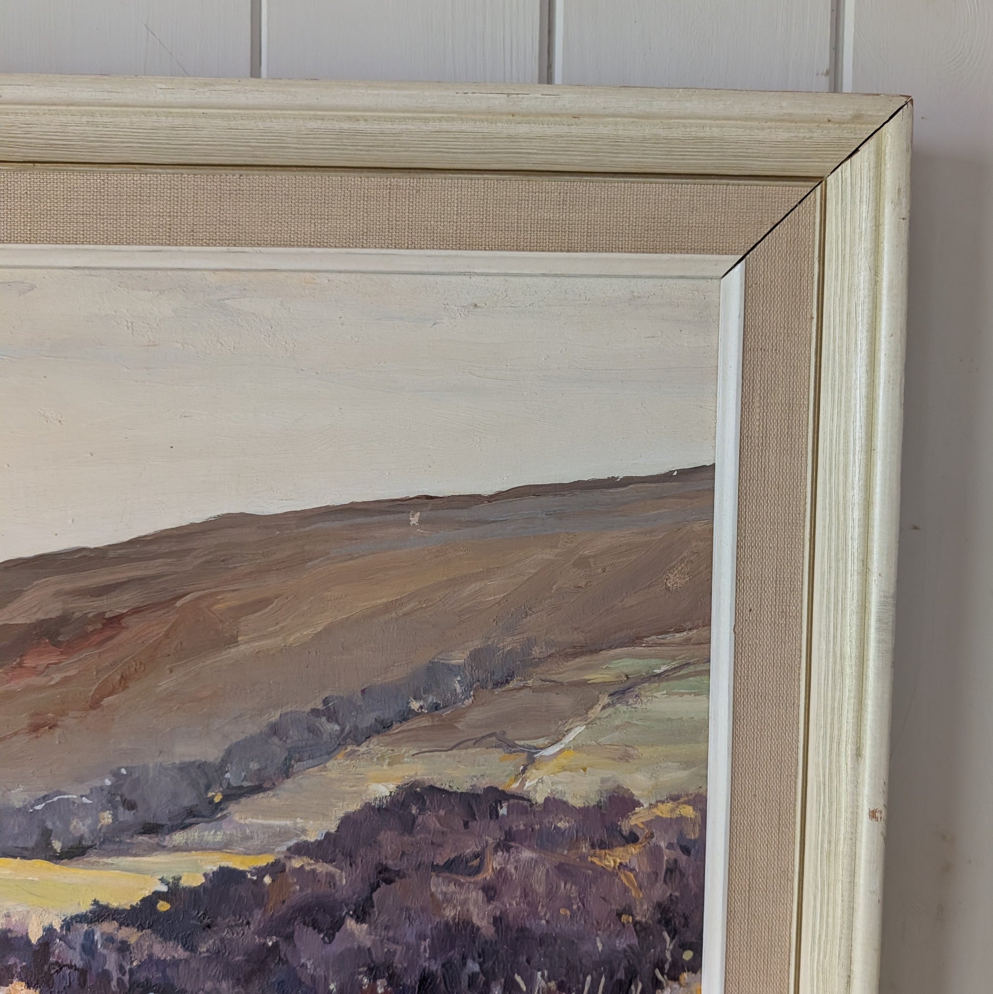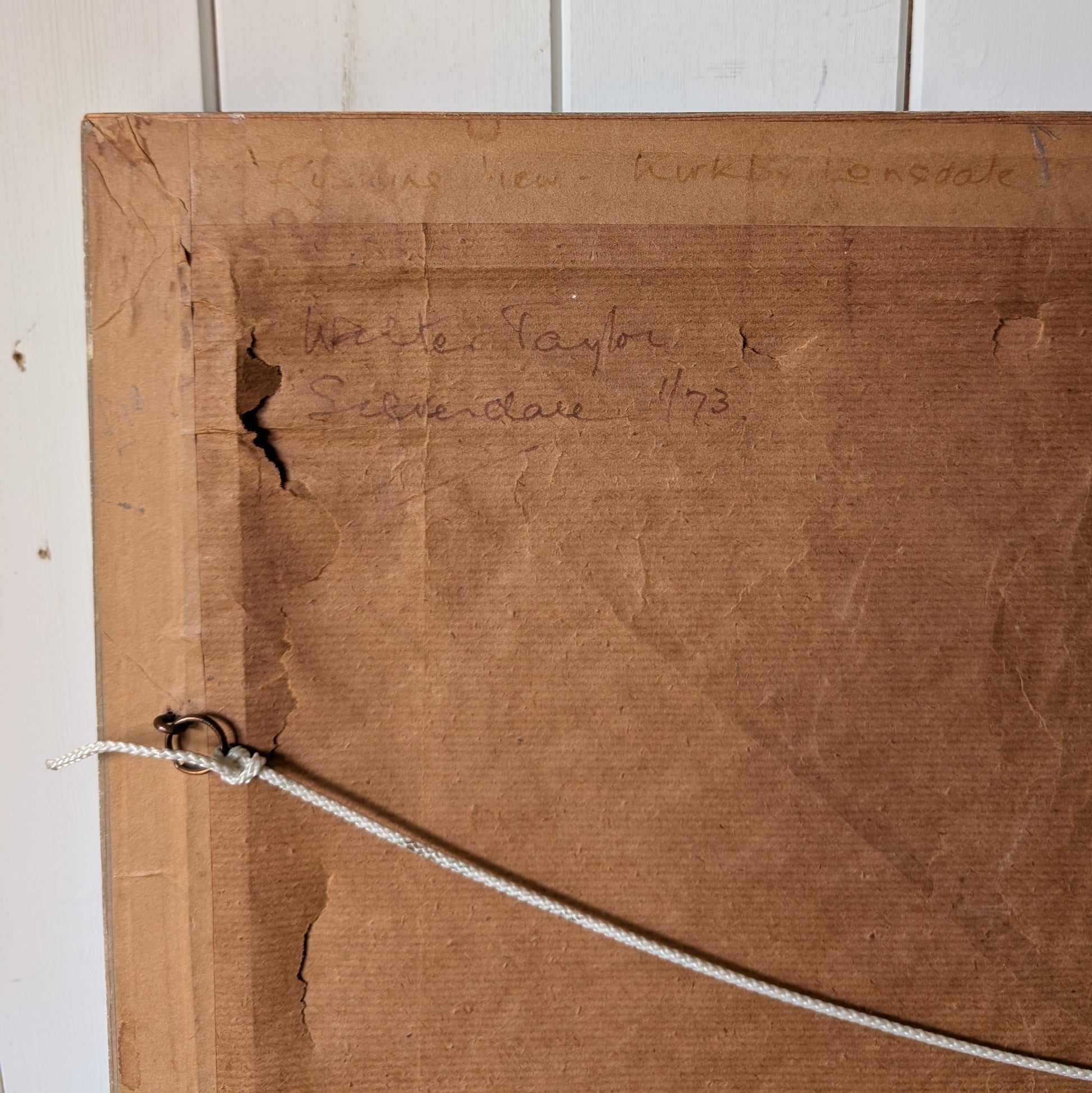 For sale is this very beautiful Vintage landscape painting by Walter Taylor dated 1973. It depicts the Lune Valley near Kirkby Lonsdale. This tranquil oil painting features the River Lune winding through pastures with grazing sheep, set against a backdrop of rolling Cumbrian hills. The artwork has a naturalistic style with a warm palette and is presented in a it's original mid century frame. It's a beautiful piece of pastoral English art, perfect for adding a touch of classic charm to any space.