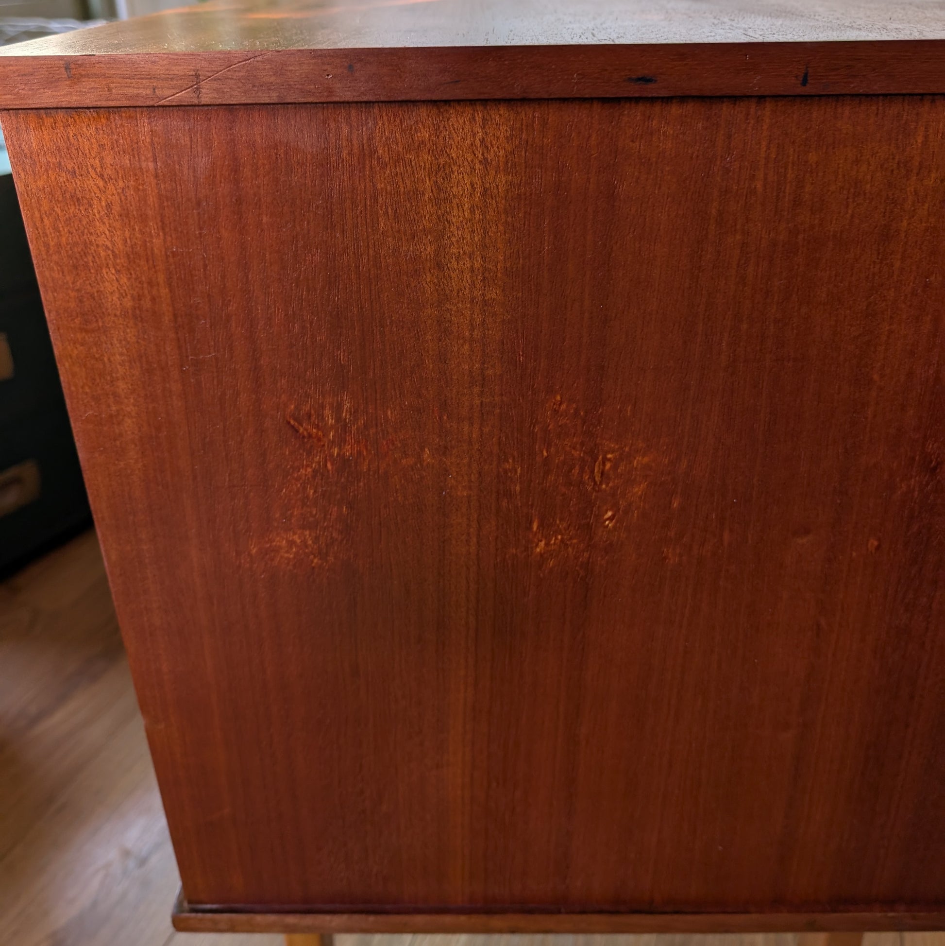For sale is this very stylish Mid Century Sideboard. It's a lovely piece in nice aged condition, it's been sensitively refinished keeping its patina but giving it a subtle update. The drawers and doors open smoothly and it's nice and clean. It has a particularly nice colour and tone with contrasting rosewood vaneer doors. Although refinished it still retains a few blemishes and marks etc so don't buy this if you are looking for pristine.