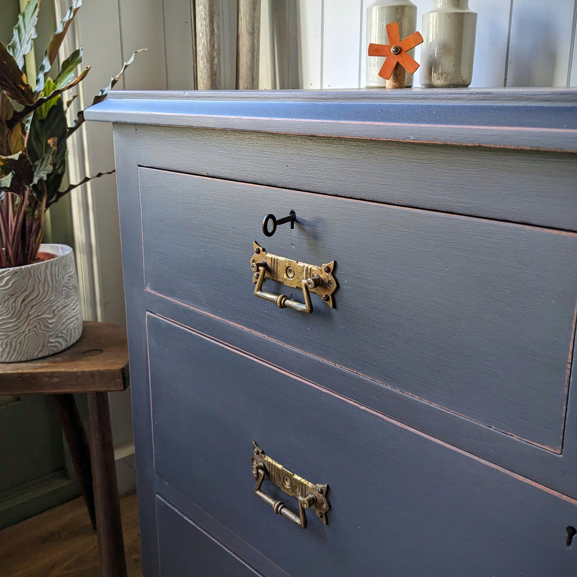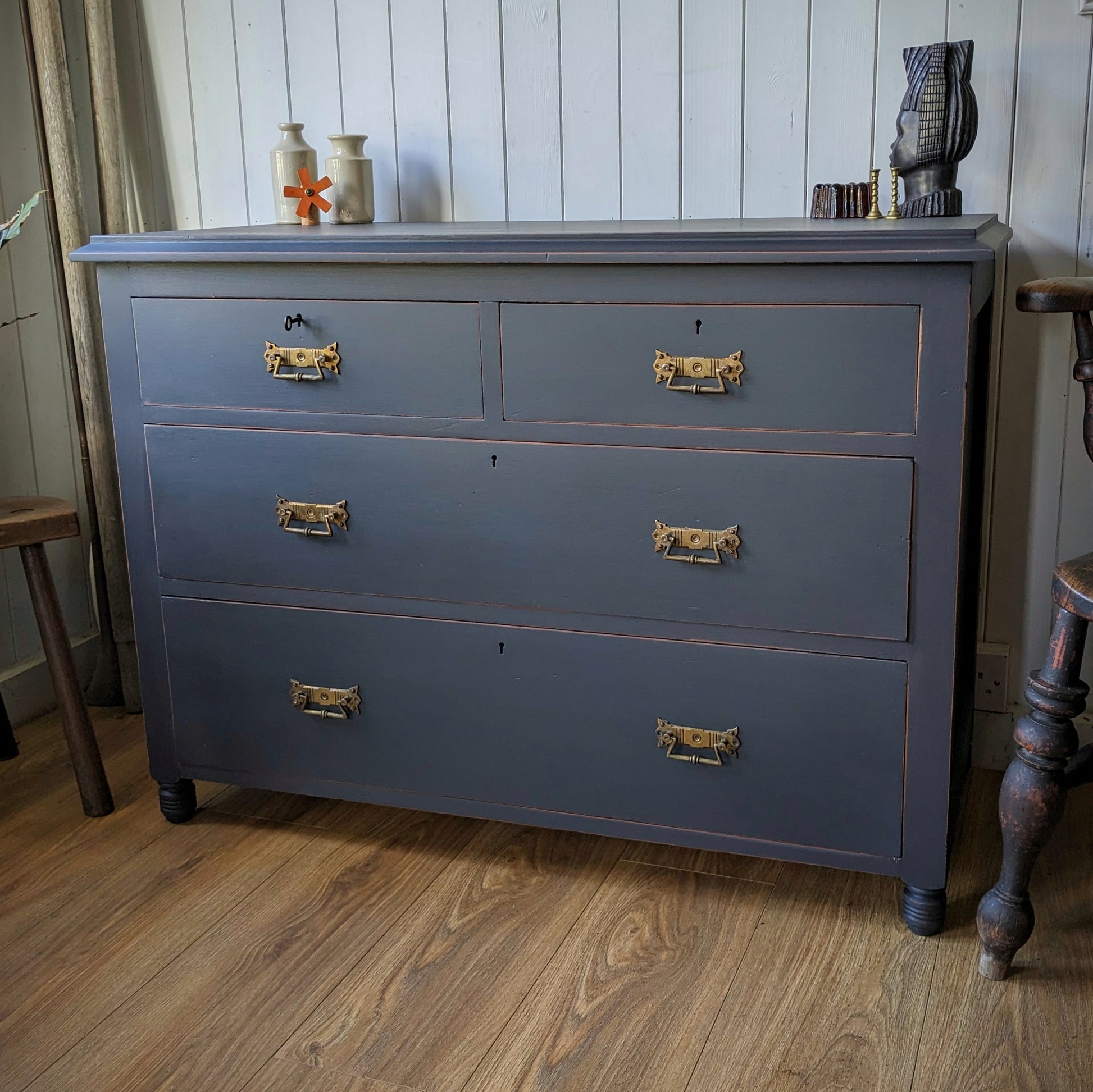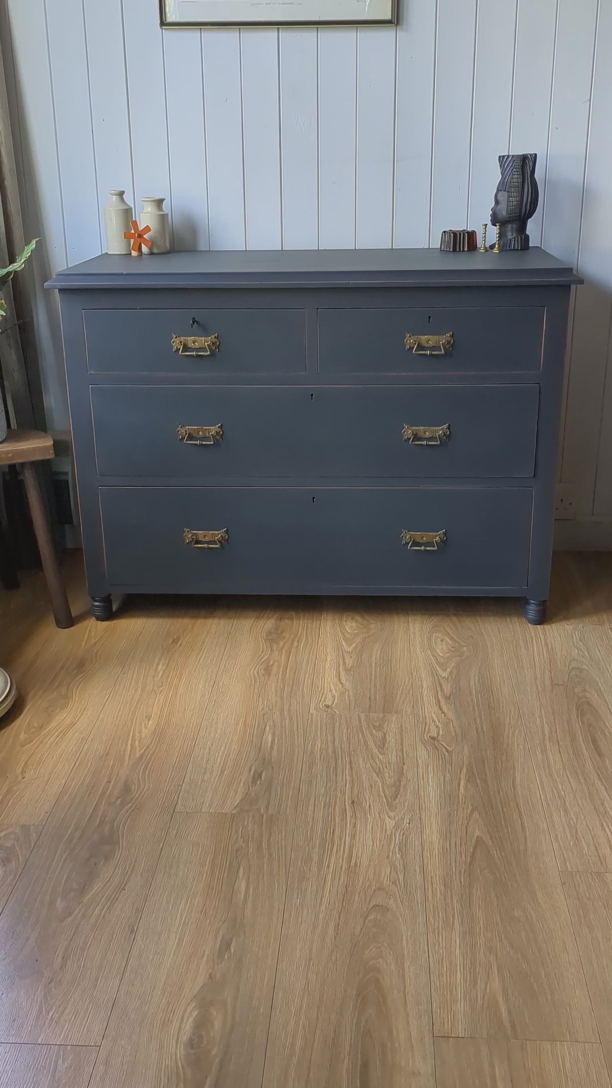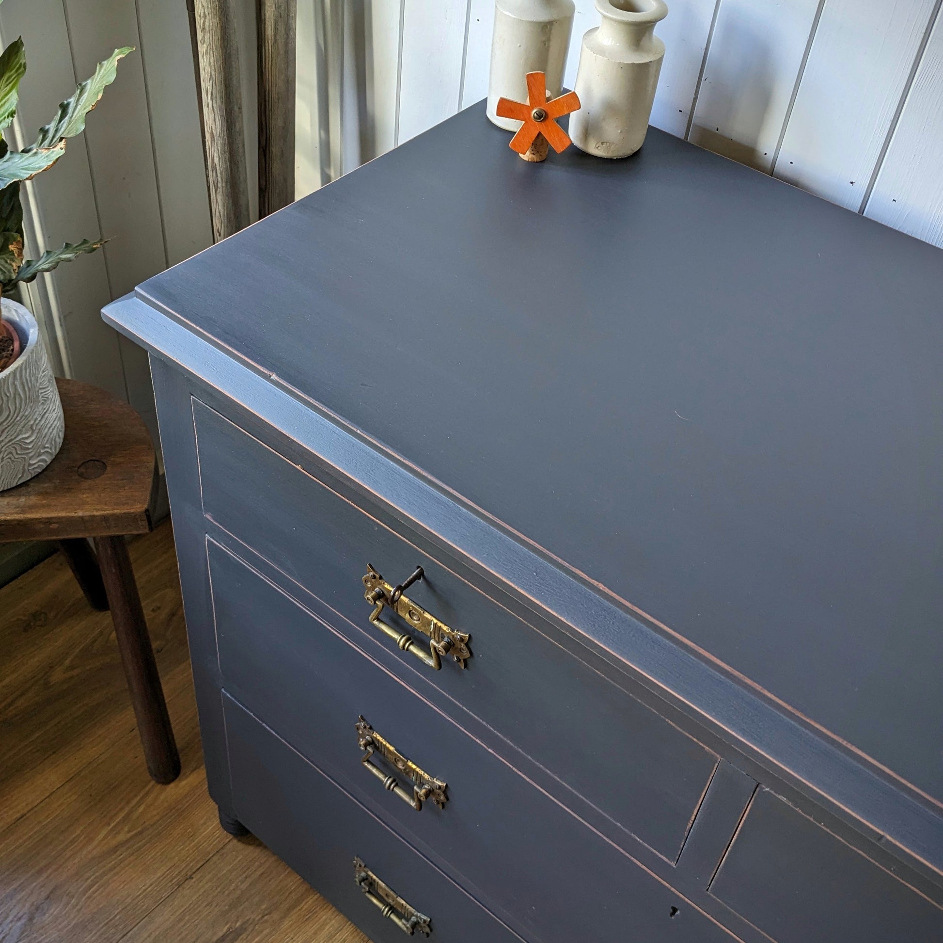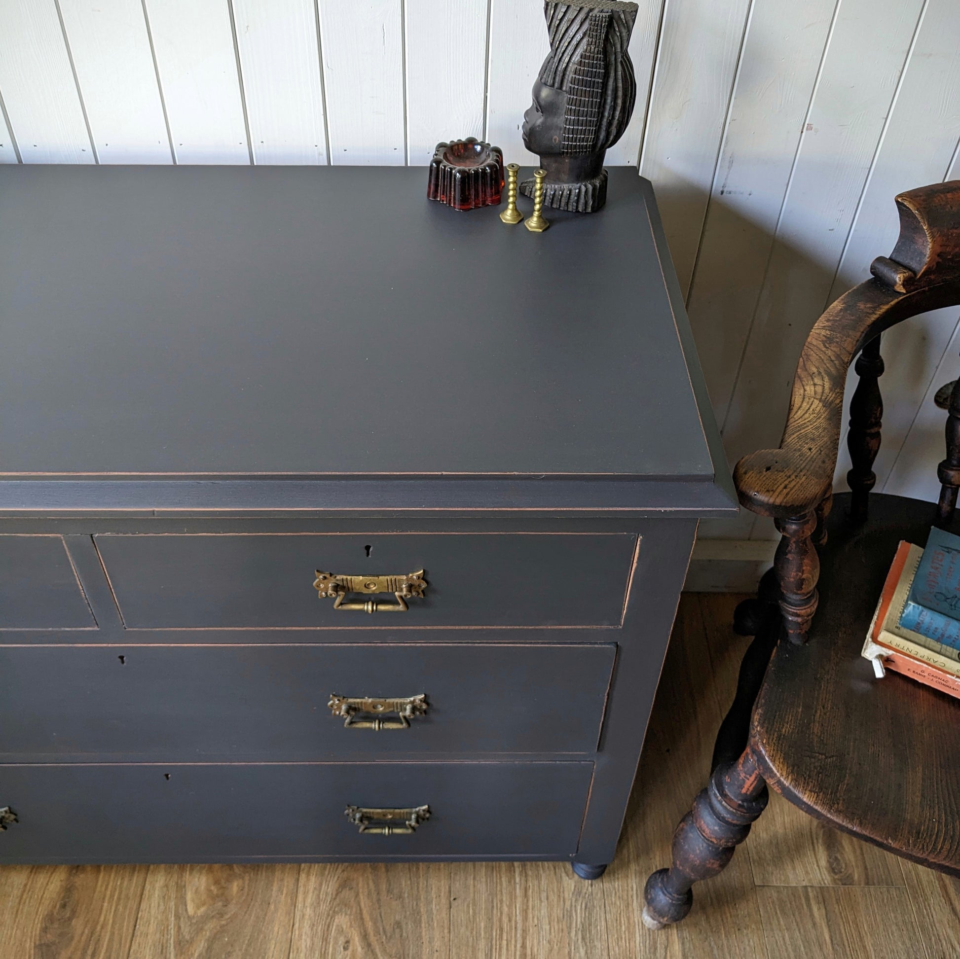 For sale is this very beautiful Upcycled Antique Chest of Drawers. It's been hand painted in Autentico's graphite with light distress. it's a really lovely shape and style with particularly nice original handles. It's solid and sturdy and the drawers run smoothly.