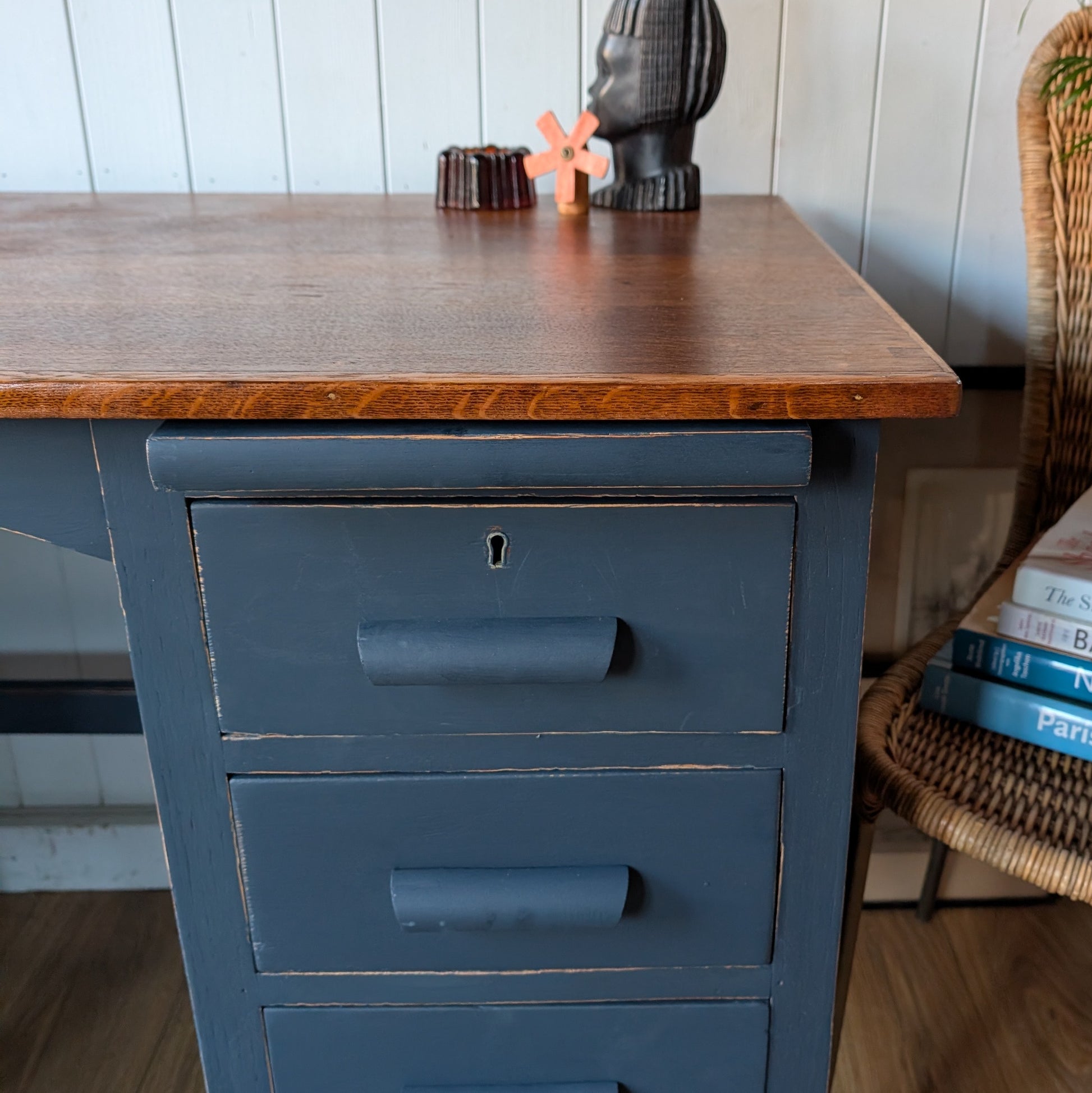 For sale is this very handsome Antique Oak Desk. It's a classic shape and style with bags of character. The top has been stripped and oiled, the base hand painted in Little Greene‘s Basalt a moody dark blue/black. It's structurally sound, the drawers run smoothly and it's nice and clean inside. It has genourous leg height and lots of storage making it a really practical desk particularly if you're tight on space.