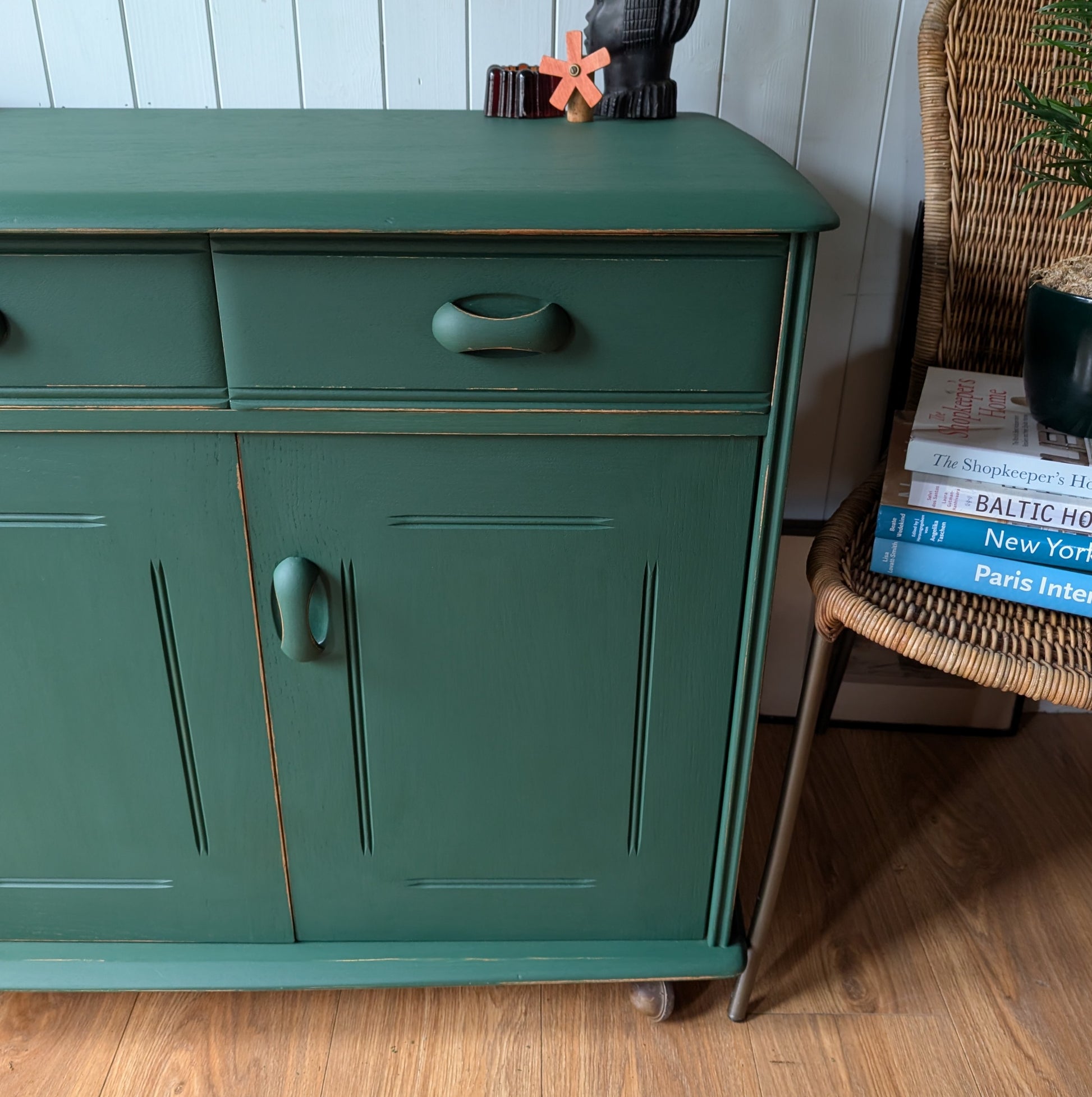 For sale is this very stylish mid century sideboard manufactured by Priory. It's a lovely piece in fantastic condition and particularly clean inside. It's been hand painted in this beautiful green by Little Greene with light distress. Obviously great as a sideboard but I think it lends itself really well as a TV unit with its modest proportions, height and bifold door. It's totally solid and, the drawers run smoothly and doors open with ease.