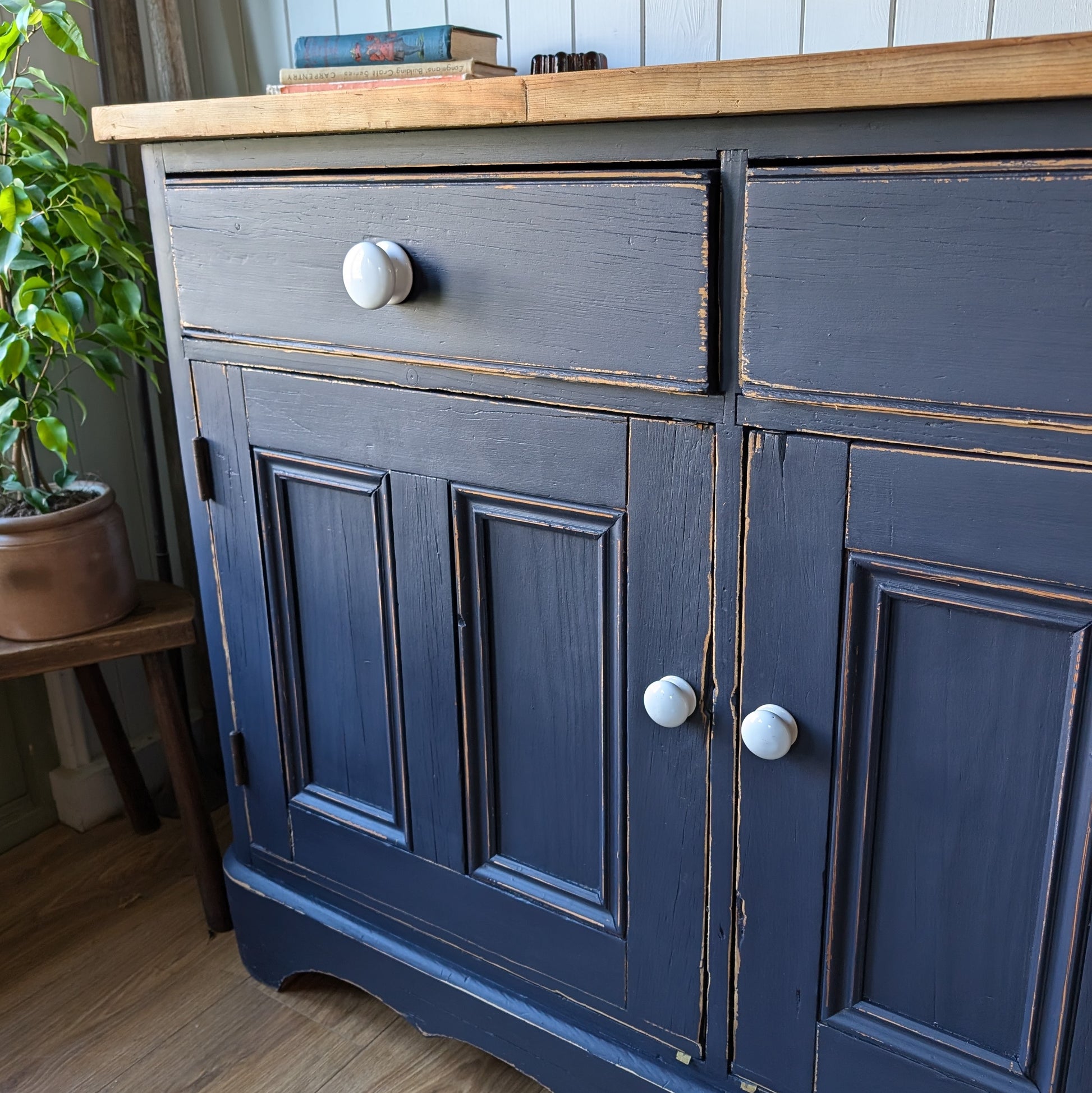 For sale is this very beautiful, rustic, Painted Victorian Cupboard. The top has been stripped and waxed, the base hand painted in Autentico's Sailors Blue with scruffy distress. It's a really lovely shape and style with slightly more unusual curved edges. The drawers run smoothly and the doors open with ease.