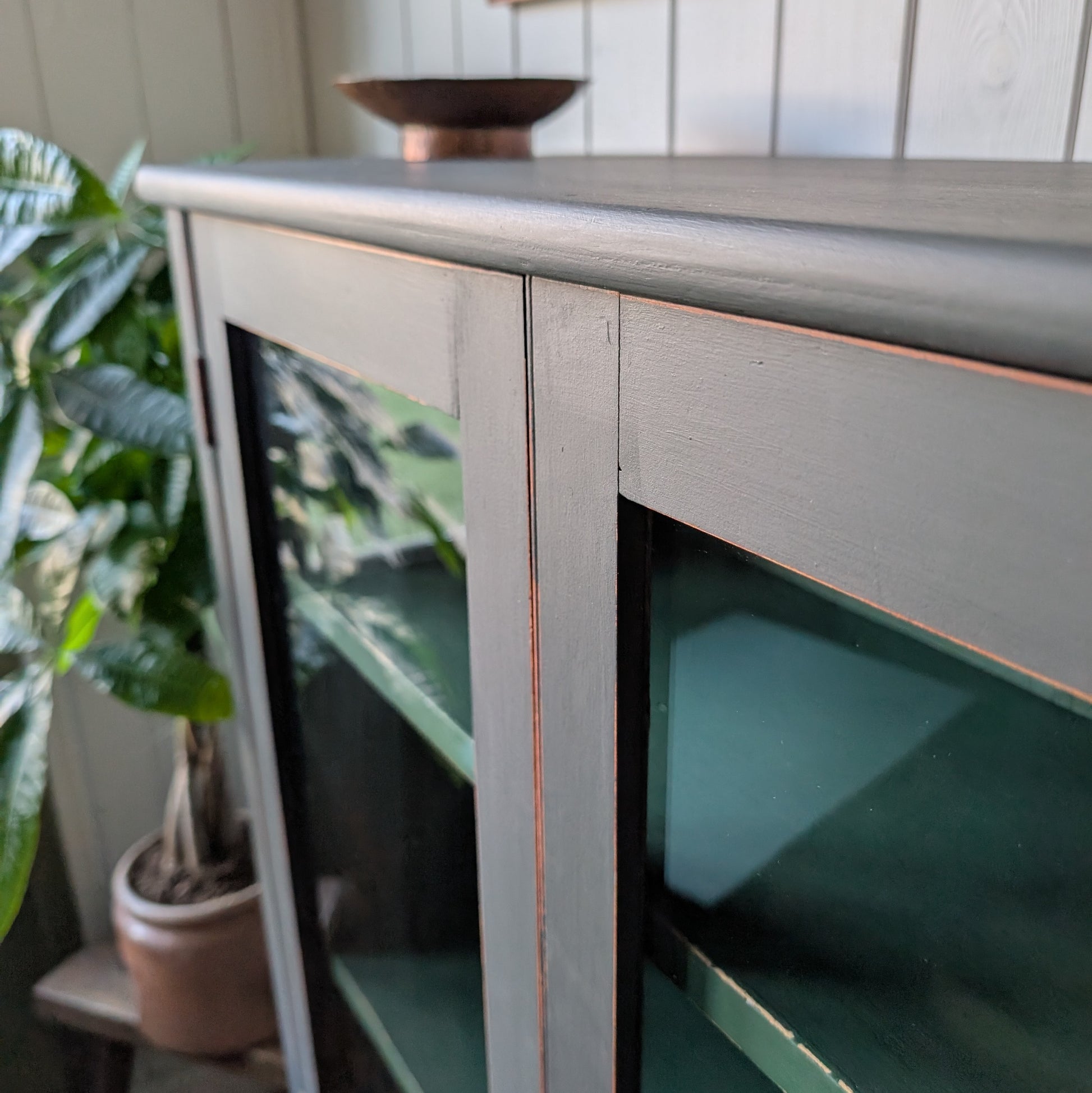 For sale is this very beautiful, very practical, Victorian Glazed Cabinet with drawer. It's a really lovely piece with a particularly nice shape and style. The glazed section is great for display and would work particularly well in a kitchen stacked with herbs, spices and jars of ingredients. It also has a nice size drawer great for storing less decorative items. The exterior has been painted in Little Greene‘s Lamp Black with light distress and the inside with a beautiful strong vintage green. All in all a lovely piece which would add character to any room.