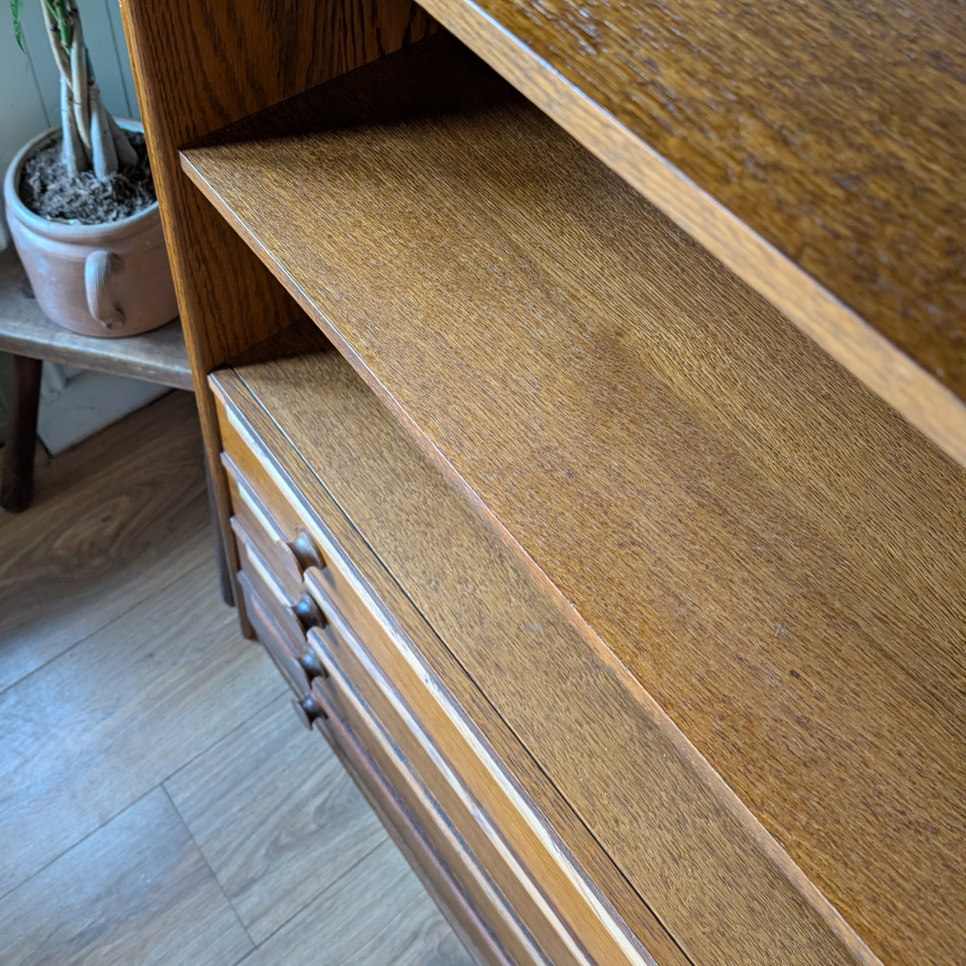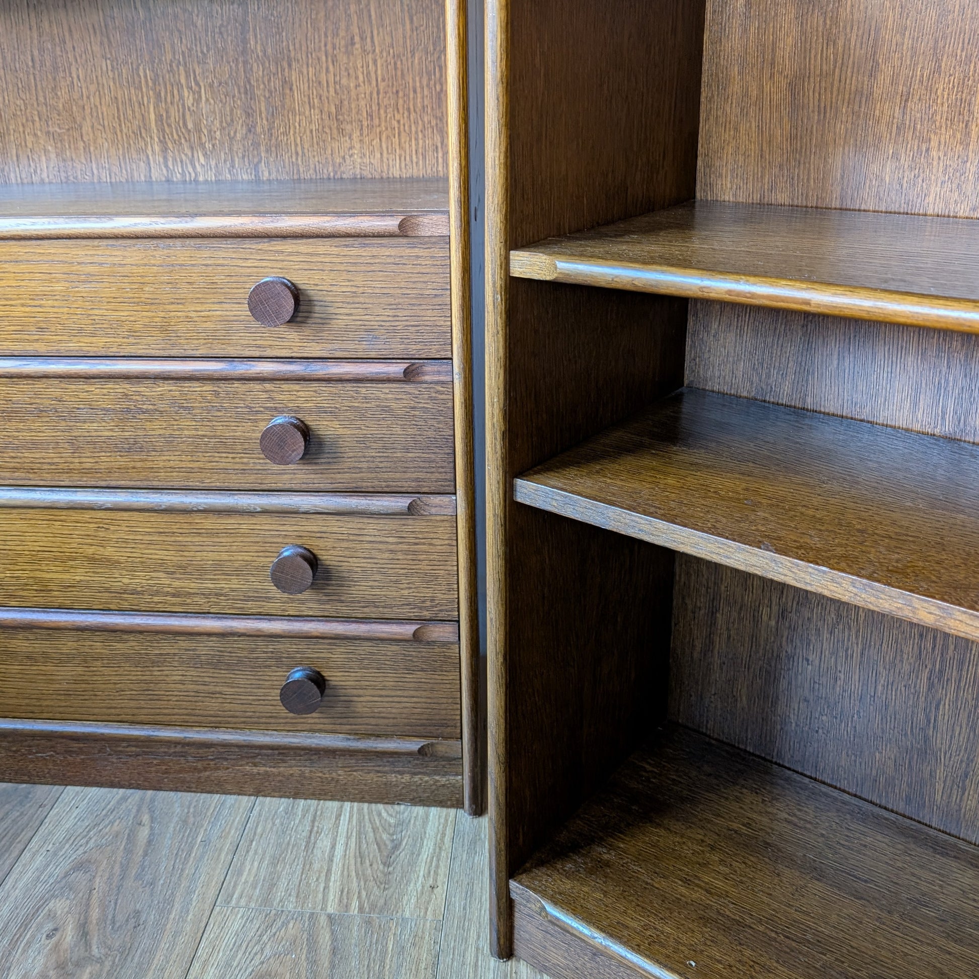 For sale is this stunning pair of vintage, oak veneer, freestanding, bookcases. They come in near perfect condition, they're particularly good quality and have the most gorgeous oak grain, color and tone. These were assembled and used in one office for the past 50+ years meaning they are in near mint condition. They have really stylish, subtle details which really adds to their character and charm. As you can see one of the bookcases has 4 drawers adding a little more practicality. All in all a stunning pair of Bookcases which are as beautiful as they are practical. Unfortunately I don't know the maker but the daughter of the owner thought they were possibly from Magnet.