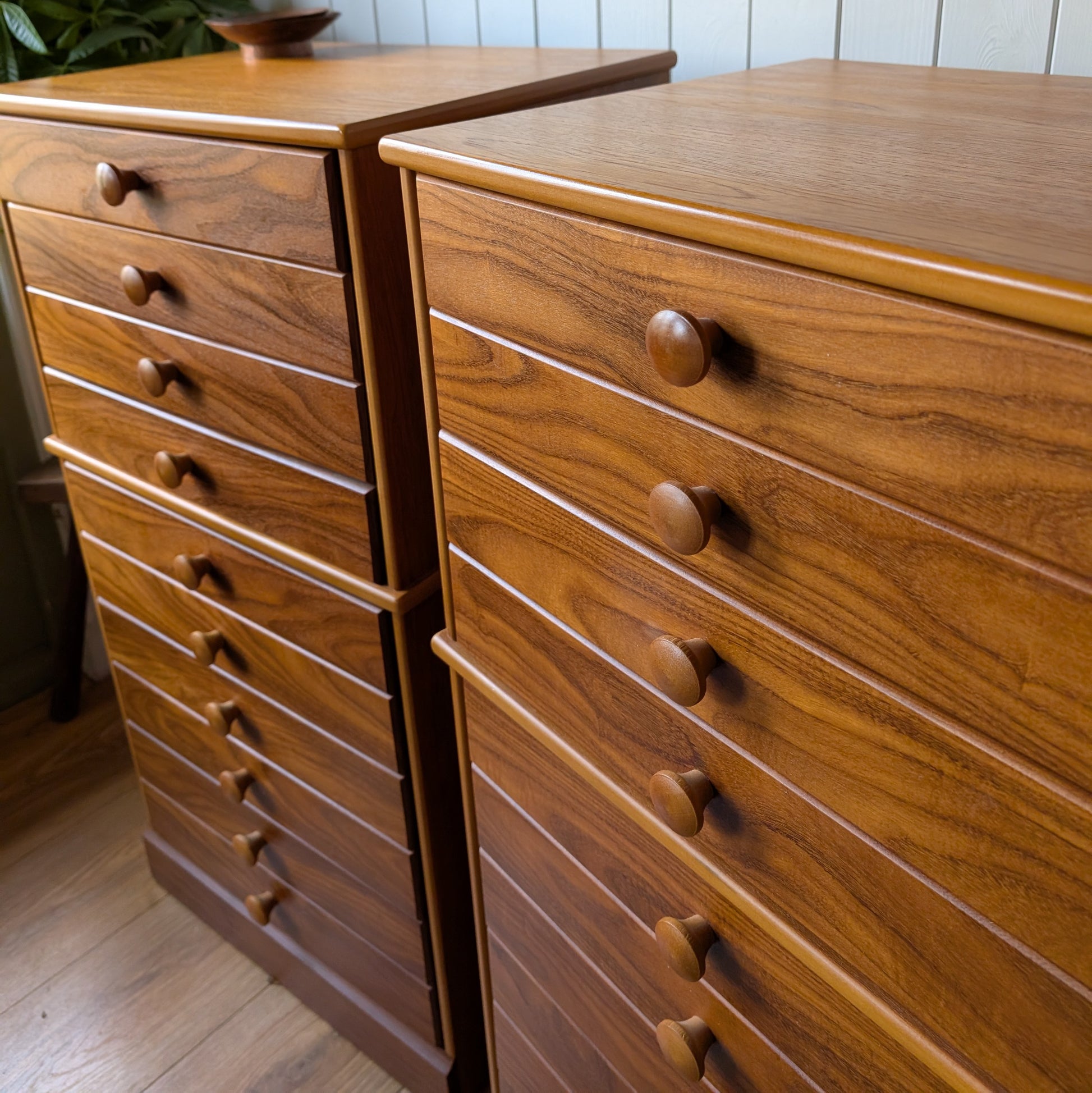 For sale is this very cool pair of Mid Century tallboy chest of drawers. They're a really lovely shape and style, exceptional quality and come in near perfect condition. Although they look like banks of 10 drawers one set the drawers are double depth (2 drawer faces are one drawer) and on the other the top 4 drawers are singles and the lower 6 are doubles (3 drawers). All in all a lovely set of drawer units which would make a really practical addition to any setting old or new.