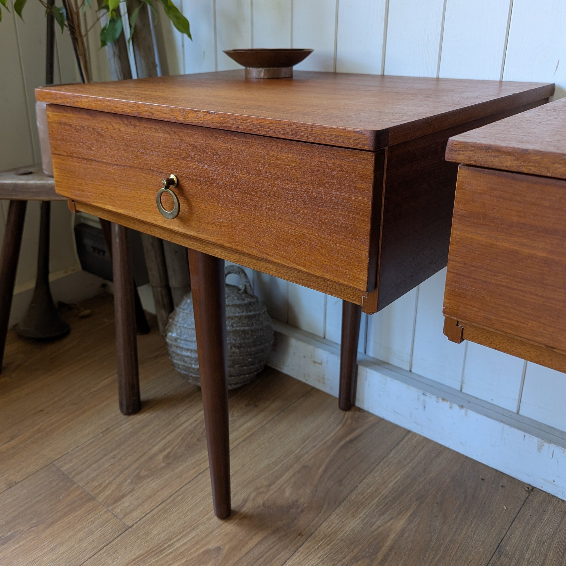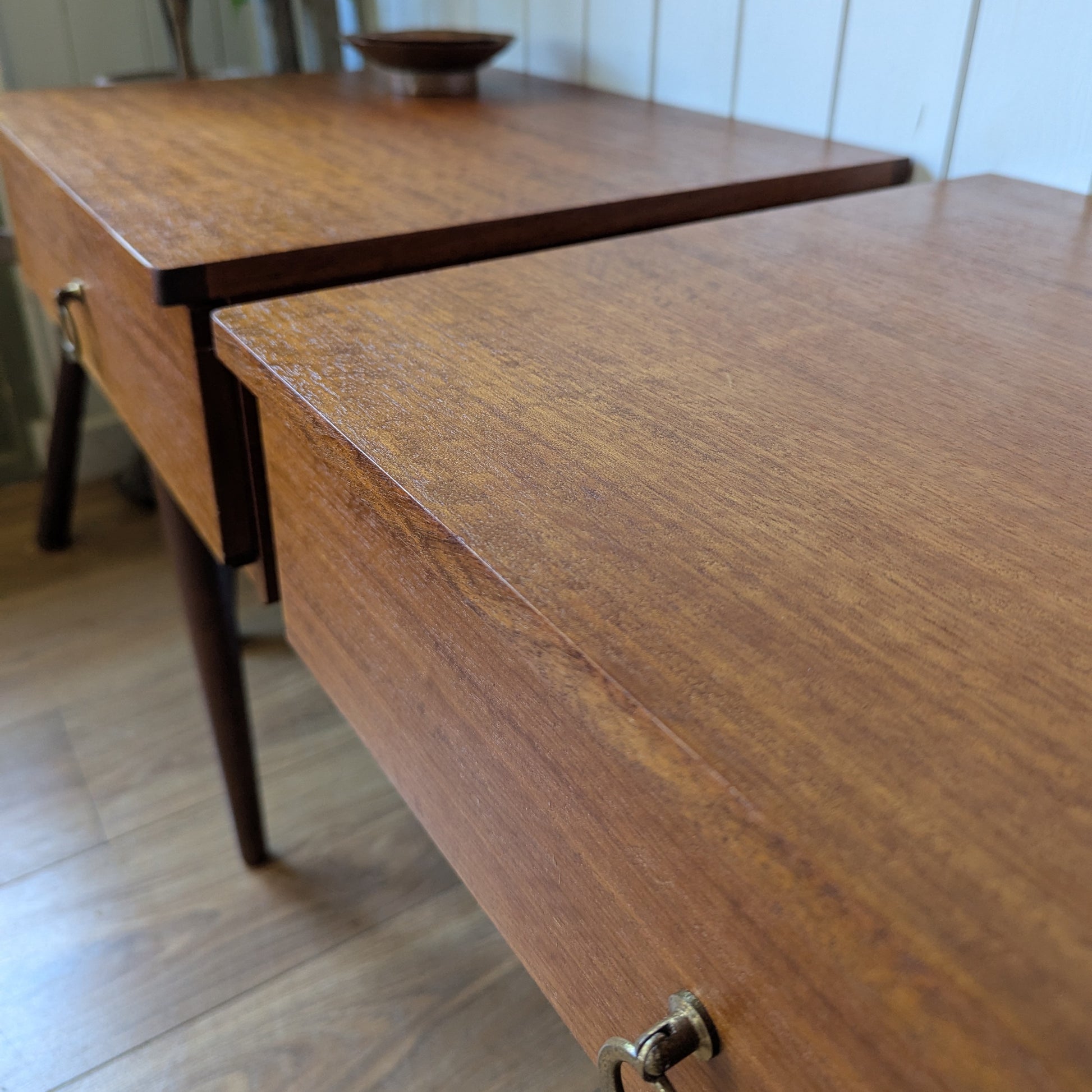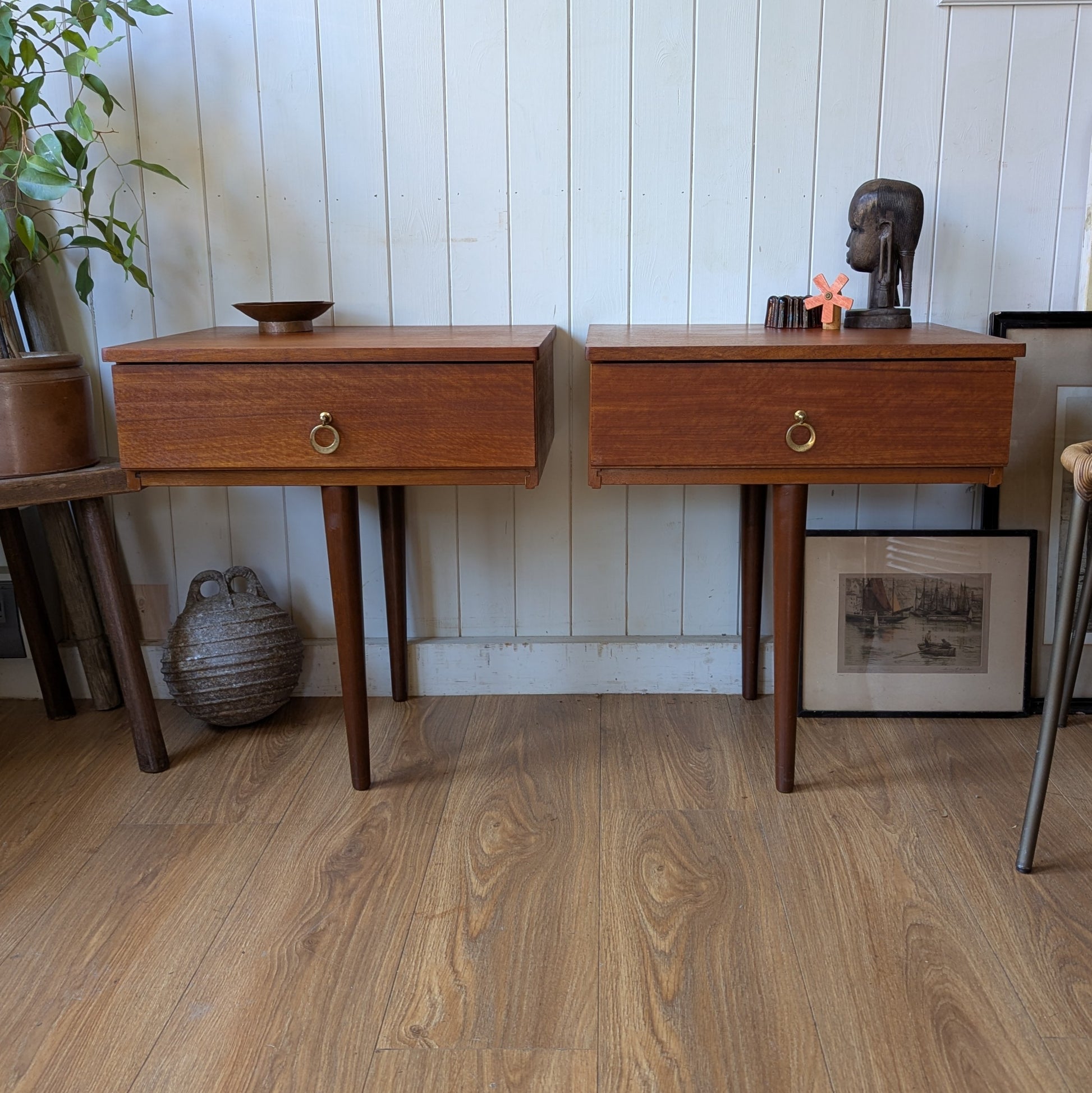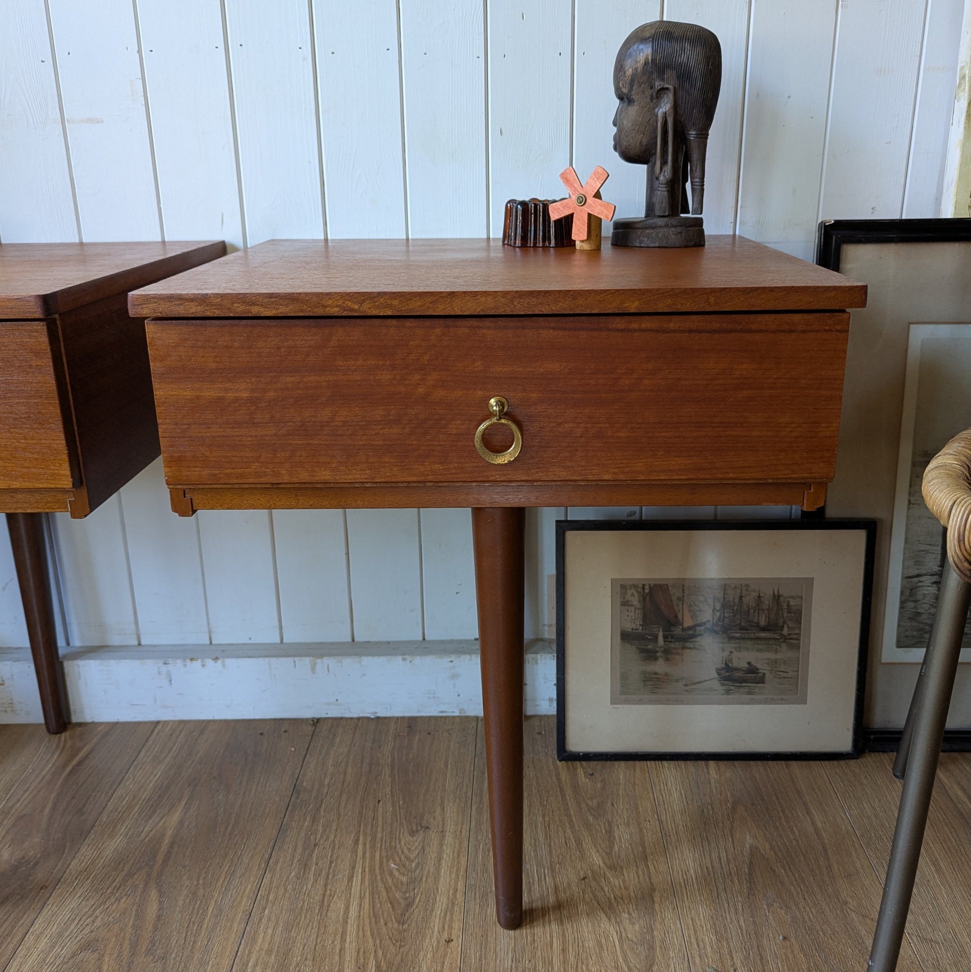 For sale is this very stylish pair of wall mounted Mid Century Bedside Tables. They've been sensitively refinished keeping their patina but giving them a subtle update. They mount to the wall easily by screwing through the back with the drawer out.