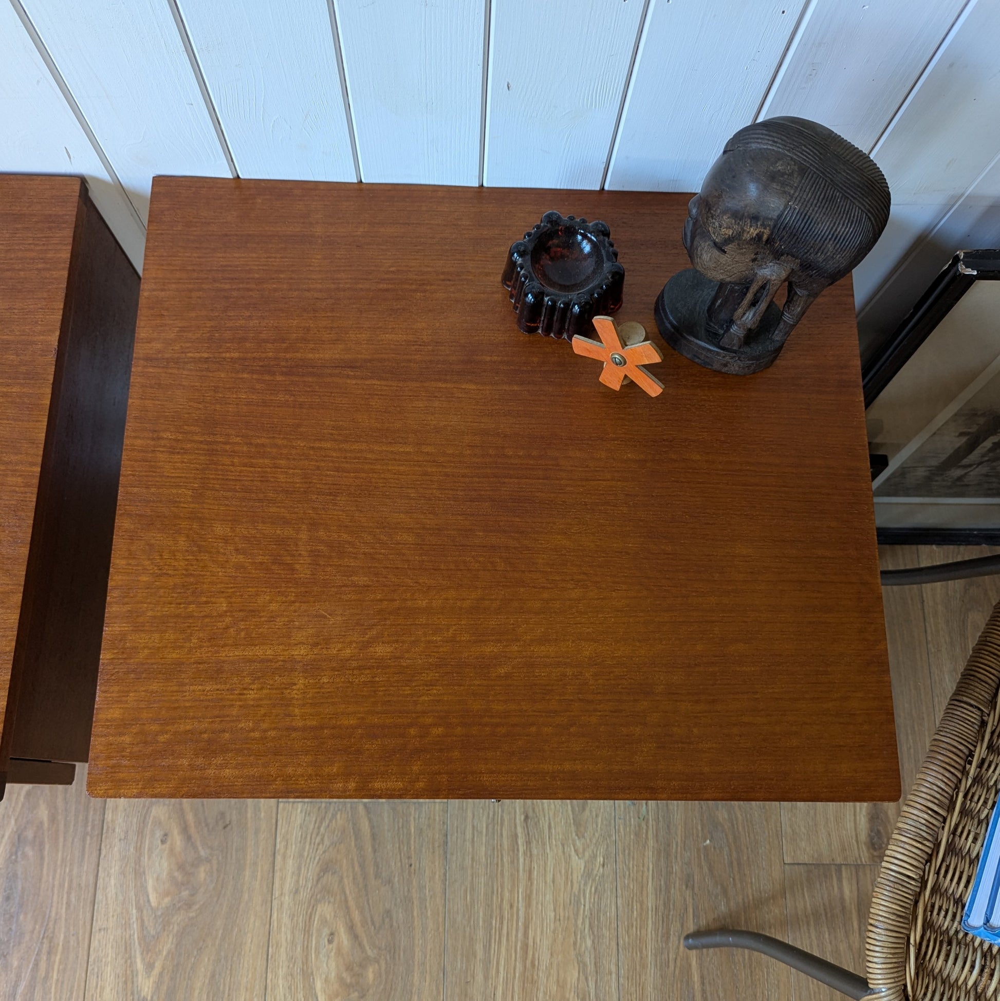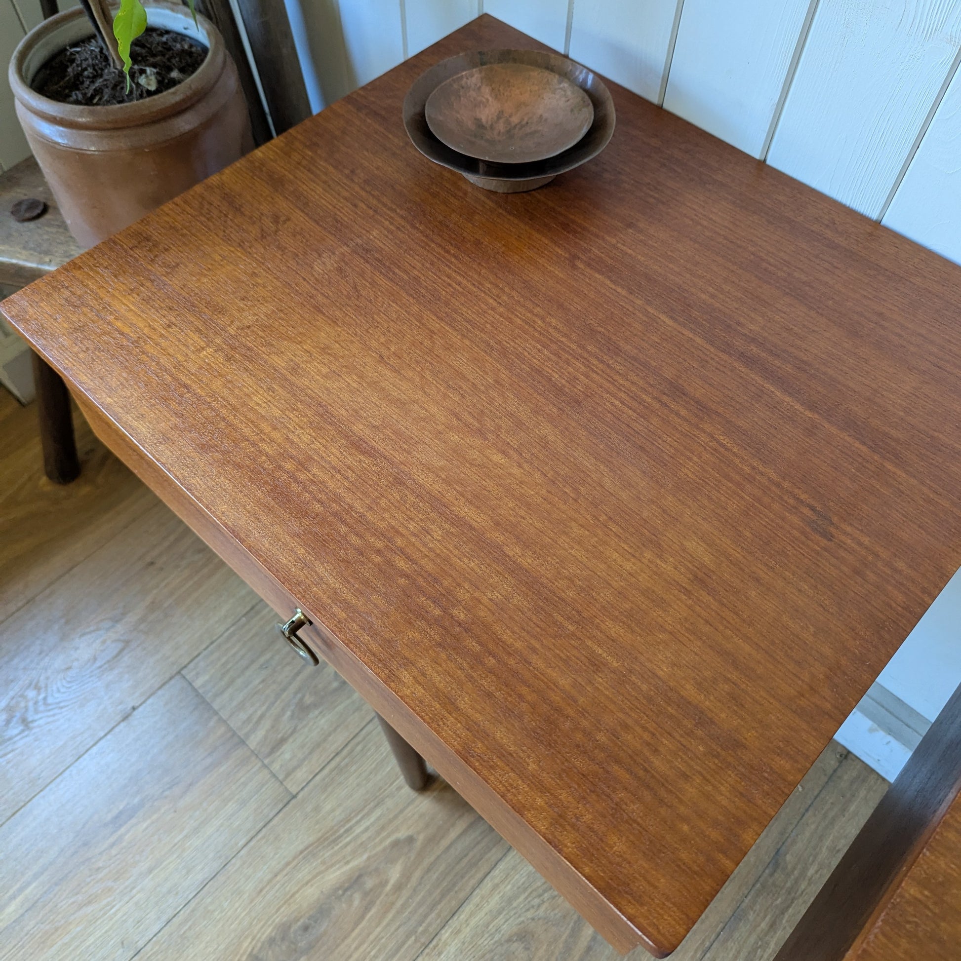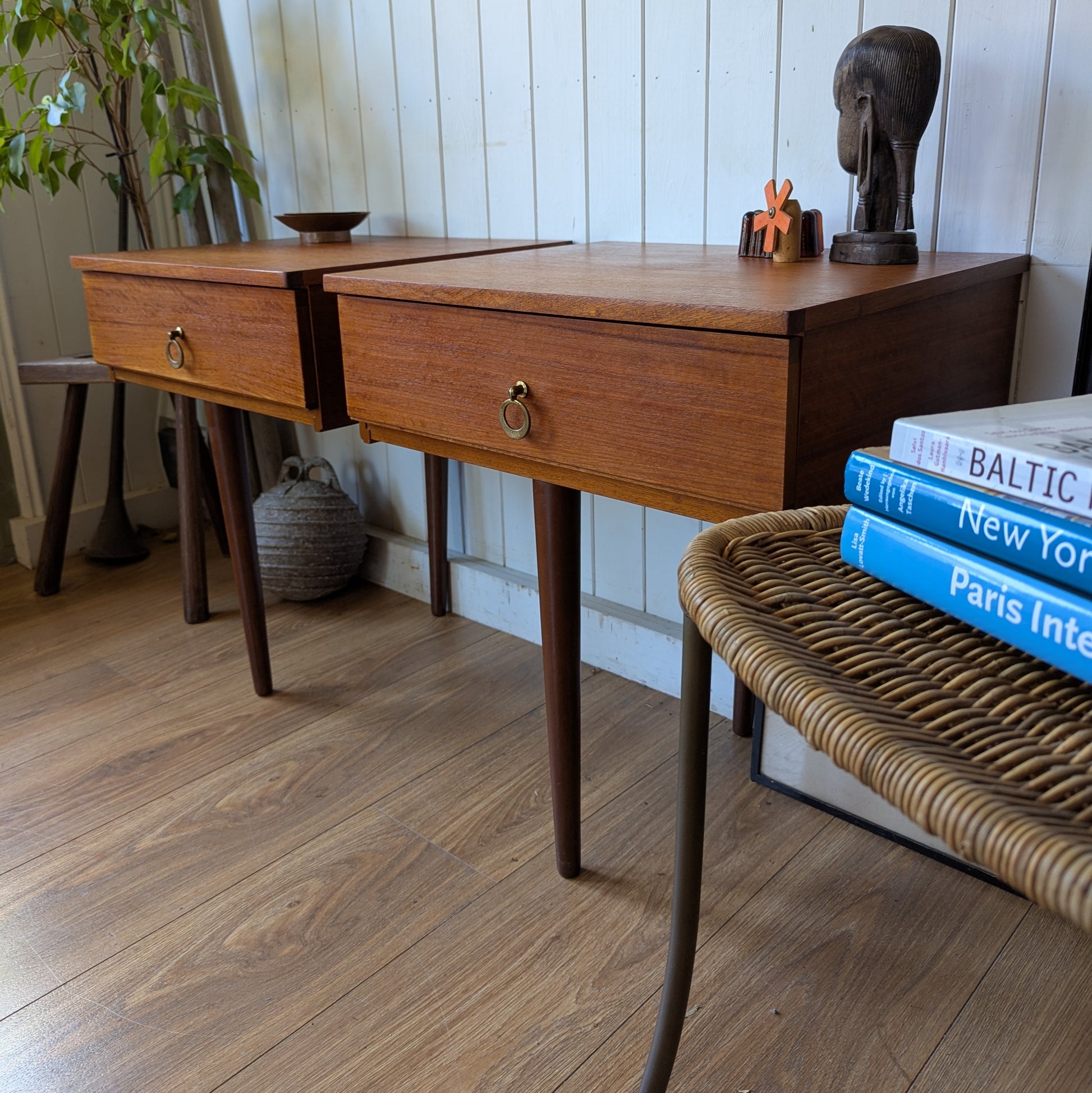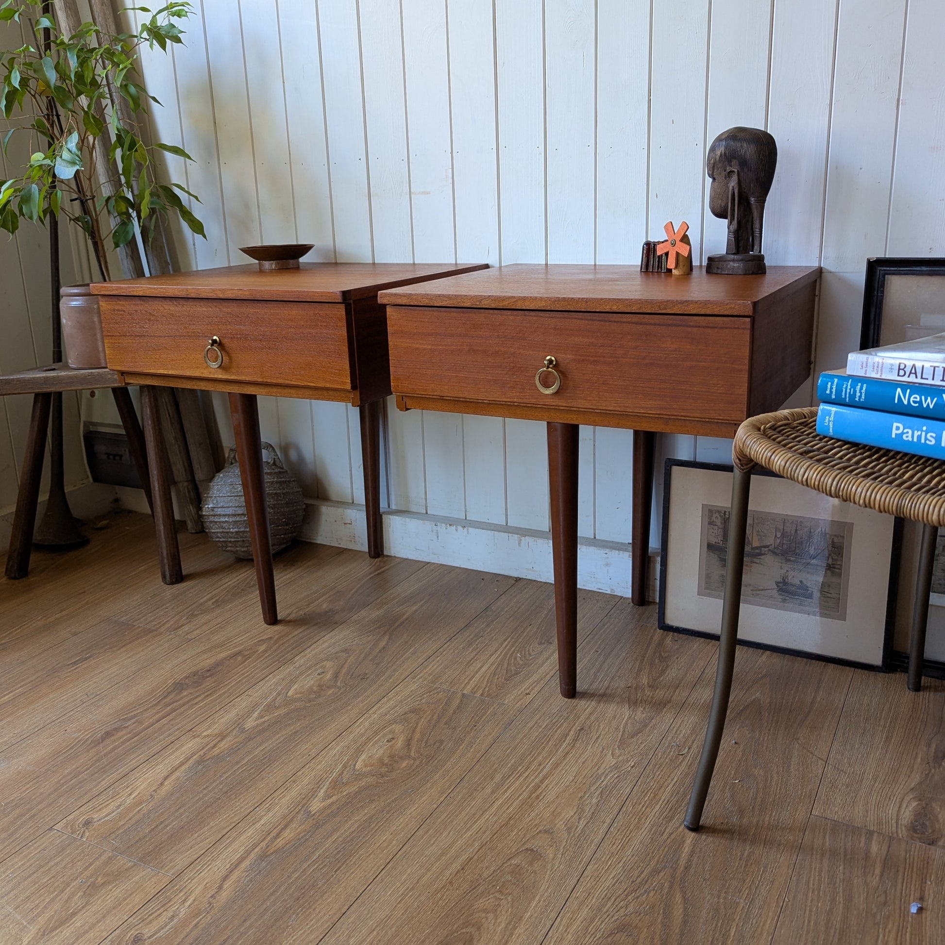 For sale is this very stylish pair of wall mounted Mid Century Bedside Tables. They've been sensitively refinished keeping their patina but giving them a subtle update. They mount to the wall easily by screwing through the back with the drawer out.