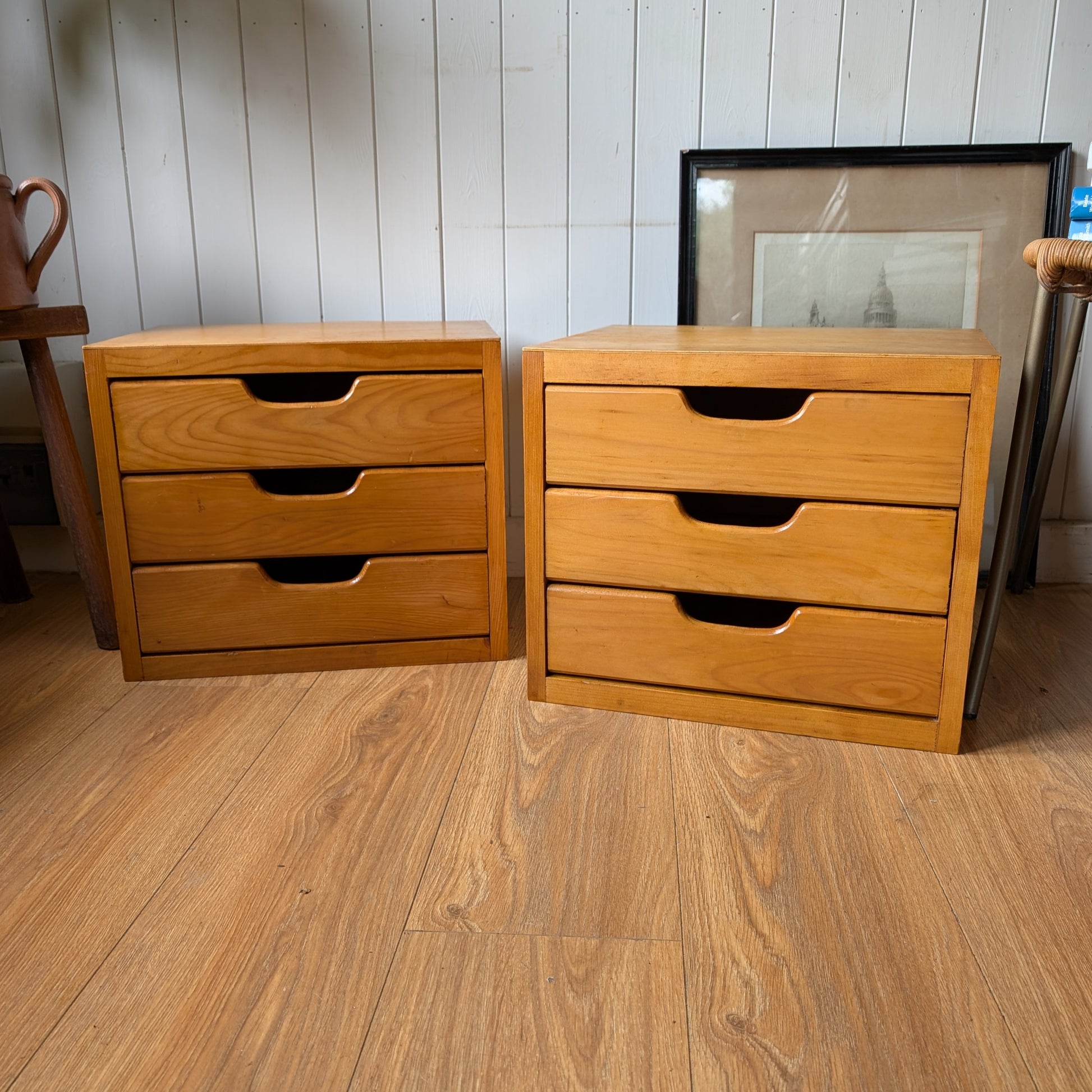 For sale is this very cool pair of very small 3 drawer chest of drawers. I'm not sure of there original use but I thought they would make a very quirky pair of small, low, bedside tables or sofa end tables with storage. They come in totally original condition I've just given them a clean and wax. They have a few blemishes bumps etc all consummate with age and adds to their originality and style.