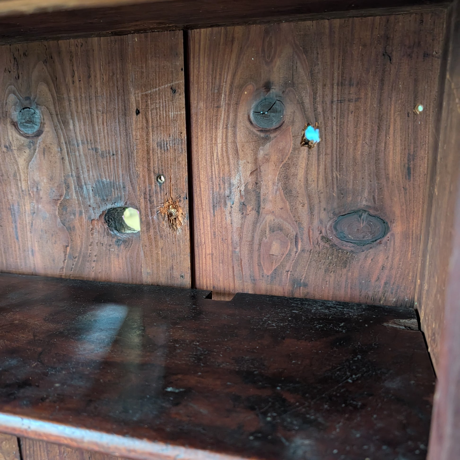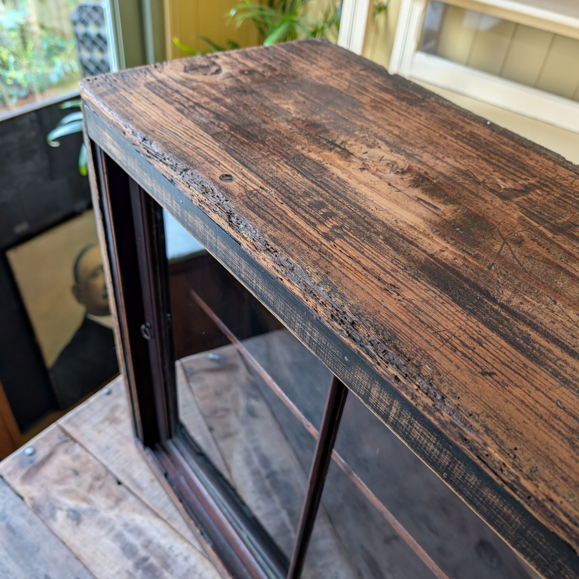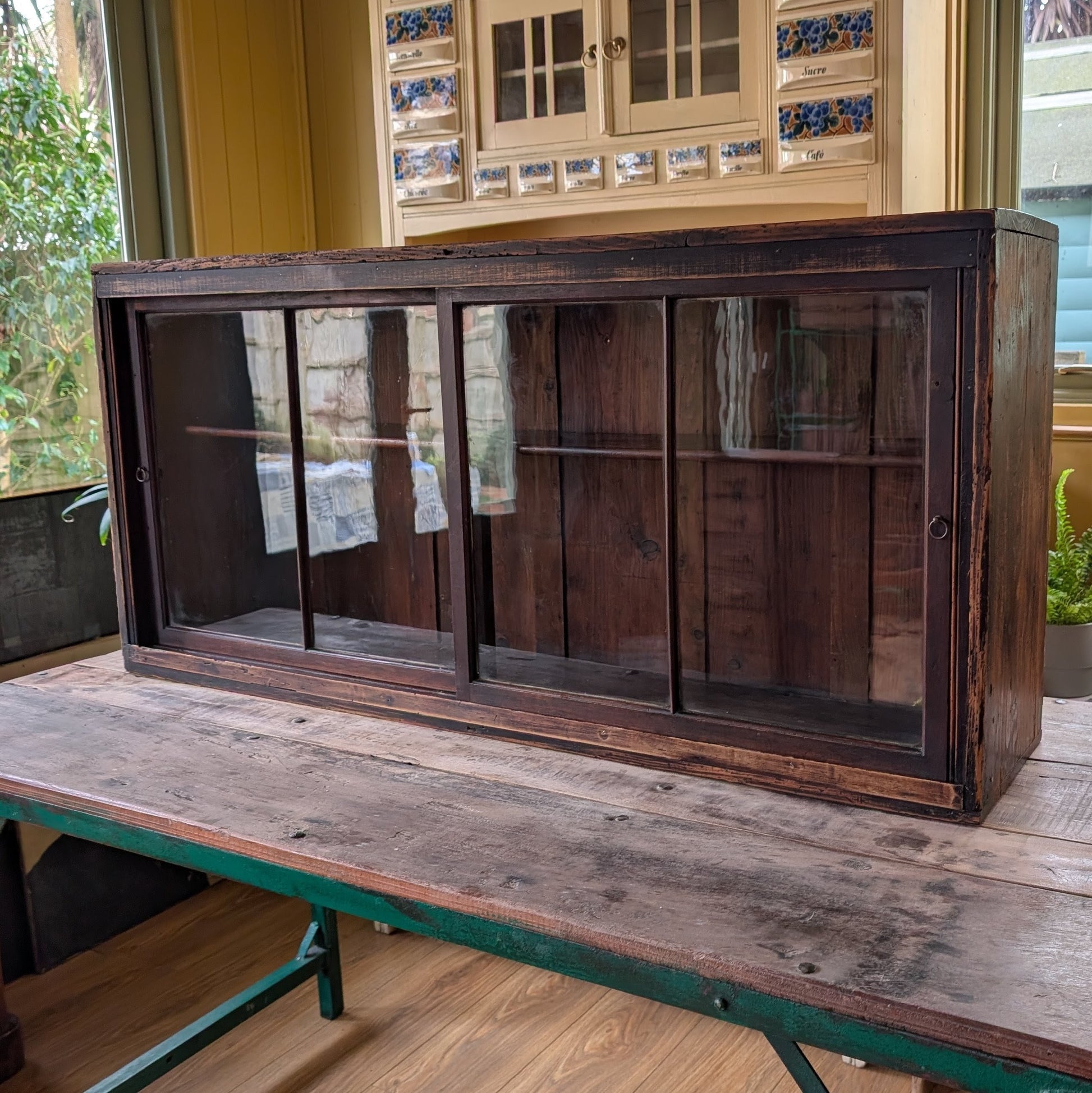 For sale is this very beautiful, very rustic, Antique Glazed Wall Unit. It come in lovely aged condition with incredible genuine patina. It's a proper scruffy old thing with tons of bumps, bangs, scratches, chips, a few holes and so on. That being said it's all of the above which really adds to its fantastic genuine character. It's had a clean and wax keeping its patina but making it nice and clean. The glazed sliding doors retain their original glass and run well. It would make a great antique kitchen cabinet, bathroom storage or perhaps for displaying a collection. To attach it to a wall I would screw straight through the back (as previously done) and then use antique bronze screw caps to hide the modern screws.