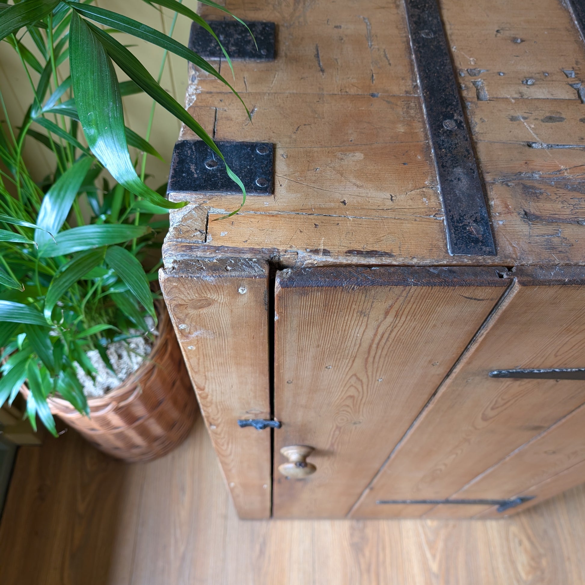For sale is this very handsome, very rustic, Victorian Pine Cupboard with metal banding. It's such a cool and unusual piece and definitely has the military or campaign look and feel. I think it has been converted from an old pine chest which on this specific piece works really well with the way the door opens and being made from pine tounge and groove planks. It's a really lovely piece beautiful yet practical and versatile. It comes in totally original condition I've just given it a clean and wax.