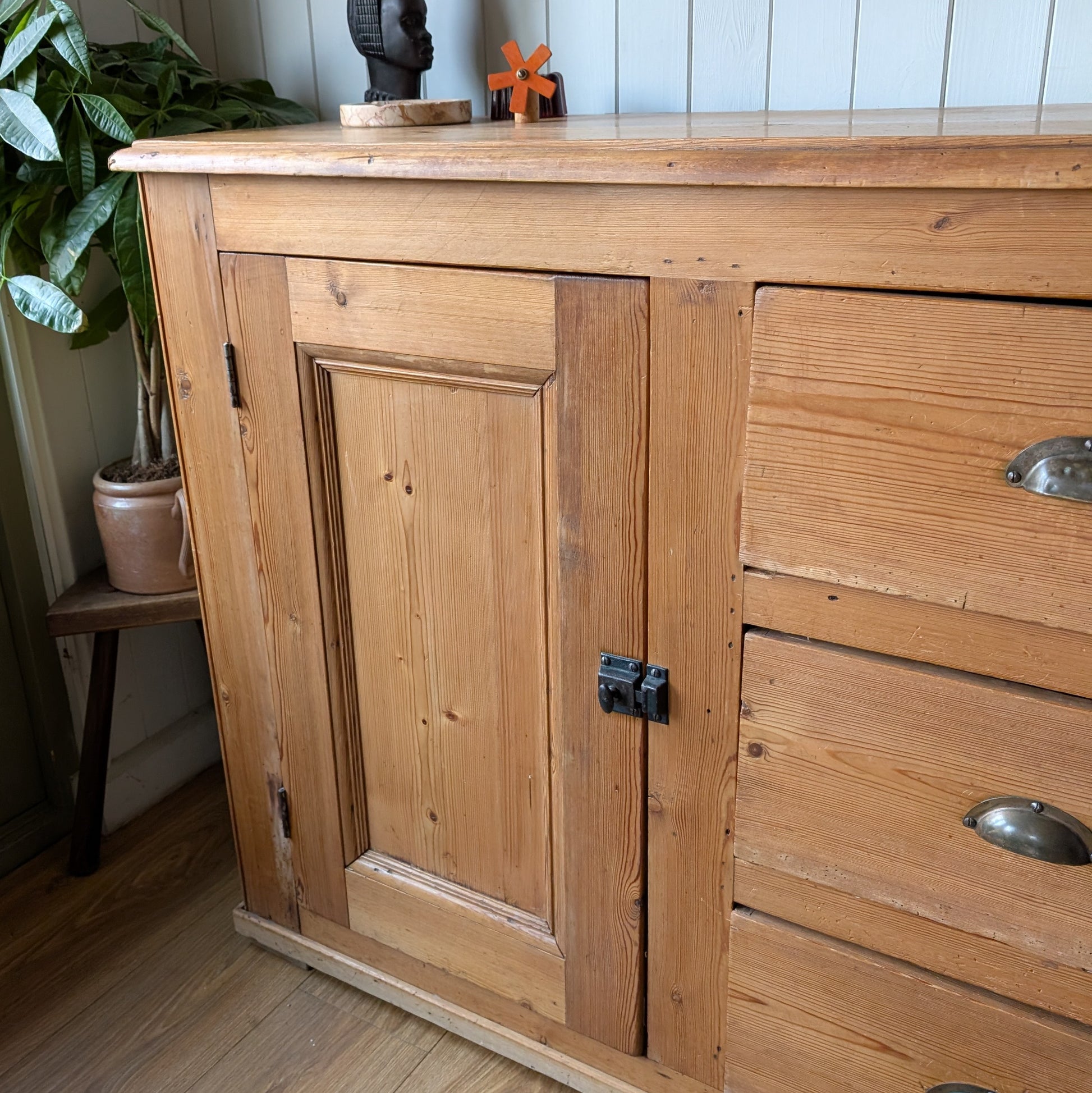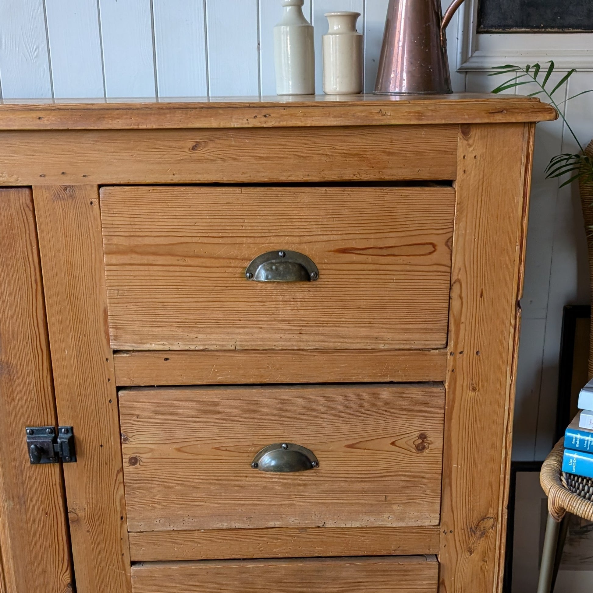 For sale is this very beautiful, rustic, Victorian pine cupboard with drawers. It's an absolute cracker with the most perfect colour and tone. It's had a thorough clean and fresh coat of wax keeping its patina but making it nice and clean. This one unusually has a large cupboard one side and a bank of 3 drawers on the other. It retains its original hardware and the drawers and door open with ease. This appears to be a Victorian Dresser Base as the top has marks showing there was a top unit.