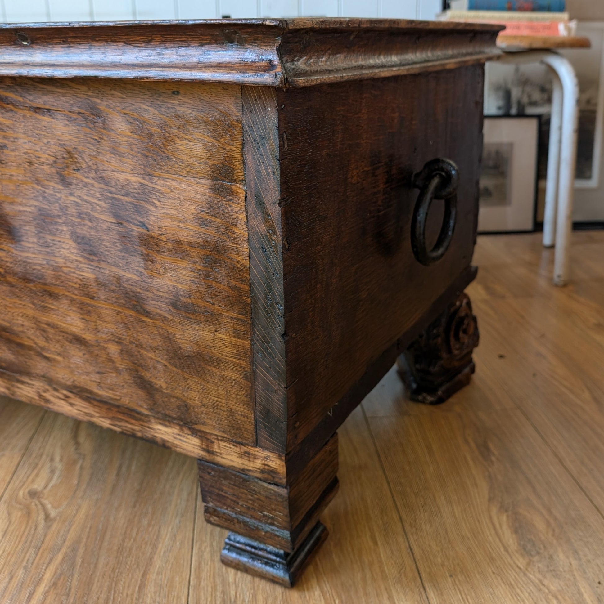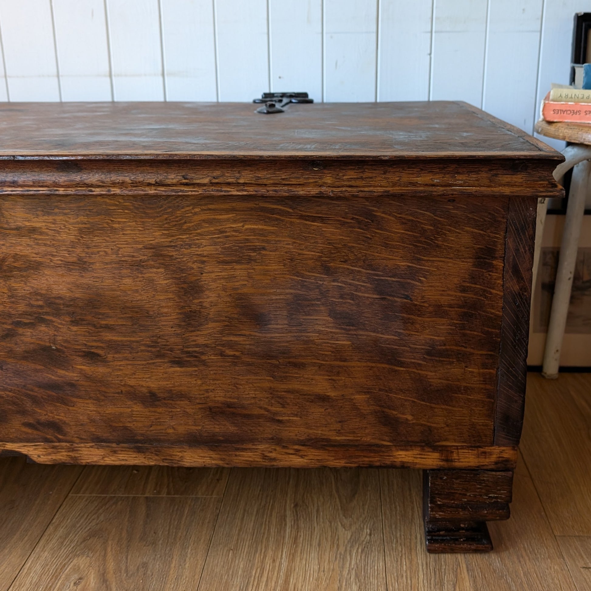 For sale is this very beautiful, rustic, scratch built oak chest. It's a lovely unusual piece which has amazing genuine patina. It's been hand built from either using a larger chest or another piece of furniture.... Upcycling before upcycling existed. It's a lovely practical piece which is strong enough to sit in making it an ideal bench seat with storage for a hallway or bootroom. The antique iron fixings really adds to its appeal. It's had a clean and wax keeping its patina but making it nice and clean. Just to note the feet have been reattached at some point with modern screws.