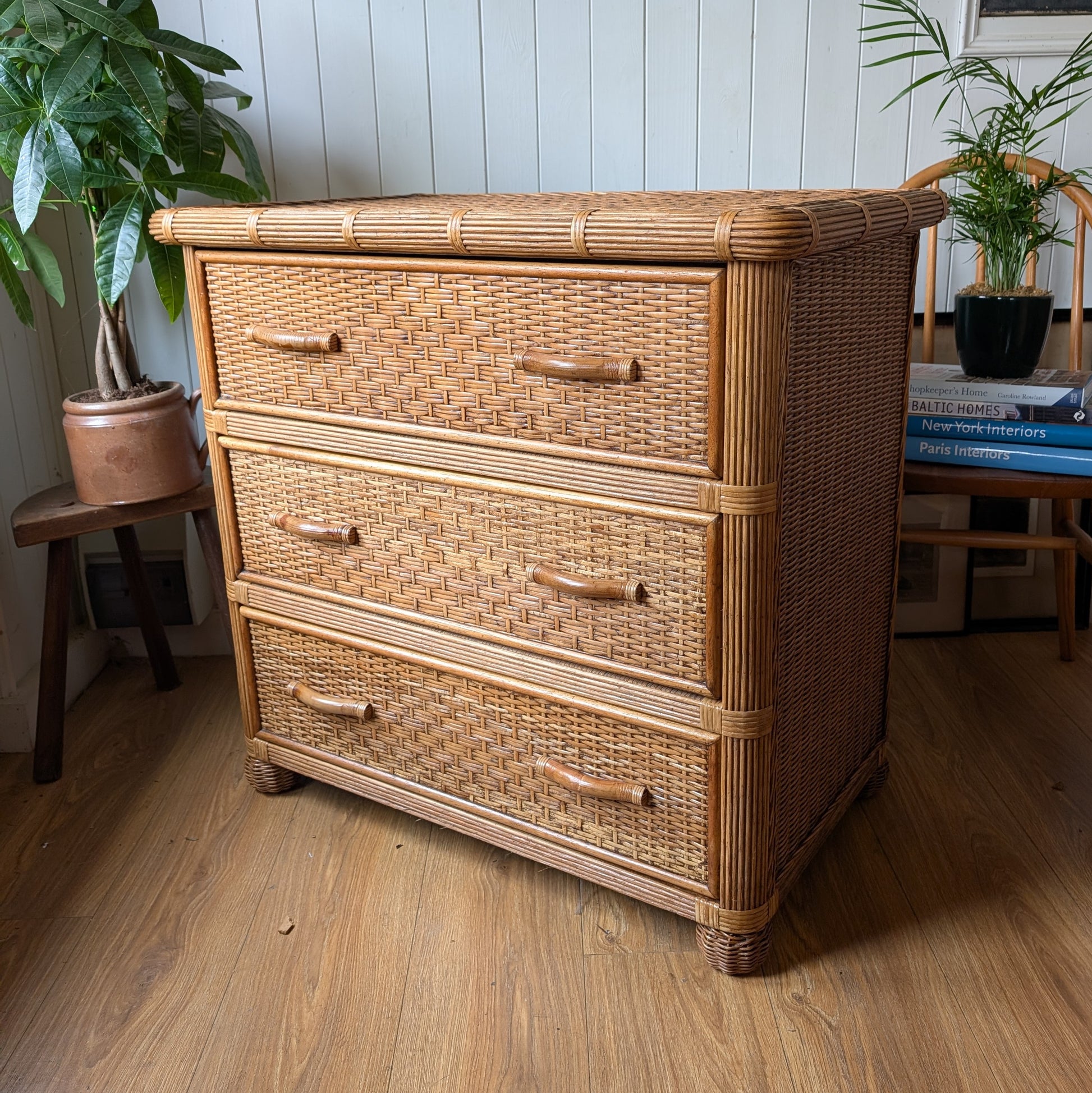 For sale is this very beautiful, vintage, Wicker Chest of Drawers. It's a nice smaller size but still offers lots of storage. It's in nice aged condition with subtle genuine patina, the drawers run smoothly and it's structurally sound. It's particularly good quality with solid oak drawer components. All in all a lovely piece which would add instant character to any home.