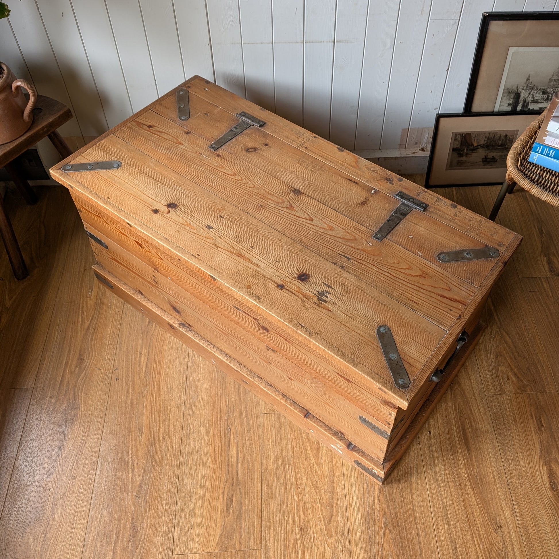 For sale is this very cool, rustic, Antique Pine Chest. It's really stylish and has an almost industrial feel with the additional fittings, steel handles and hinges etc rather than the more common brass. It comes in excellent condition and is nice and clean inside and out. It's totally original I've just given it a clean.