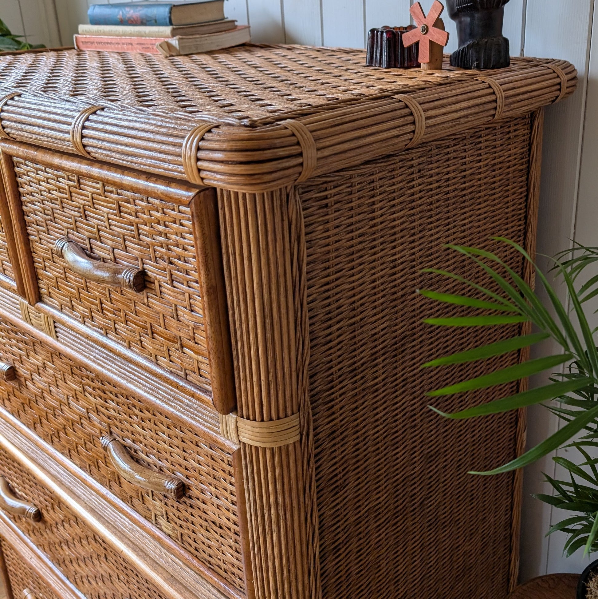 For sale is this very beautiful, vintage, Wicker Chest of Drawers. It's a really decent size offering lots of storage. It's in nice aged condition with subtle genuine patina, the drawers run smoothly and it's structurally sound. It's particularly good quality with solid oak drawer components. All in all a lovely piece which would add instant character to any home.